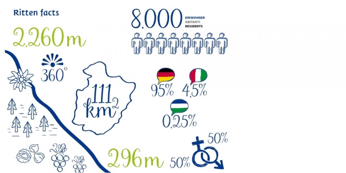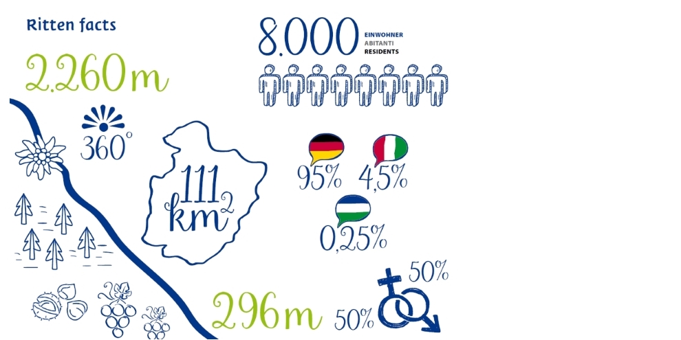 Der Ritten erstreckt sich von sonnengeküssten Weinbergen im Tal auf 296 Metern über dem Meeresspiegel bis hinauf zum auf 2.260 Höhenmetern gelegenen Rittner Horn und umfasst damit Lagen auf rund 2.000 unterschiedlichen Meereshöhen. Das führt zur unglaublich vielfältigen Vegetation des Sonnenplateaus mit Weinreben und Kastanienbäumen an den Sonnenhängen im Tal, den Föhren-, Fichten und Lärchenwäldern im mittleren Gebirgsabschnitt bis hin zu den alpinen Almwiesen über der Baumgrenze.
