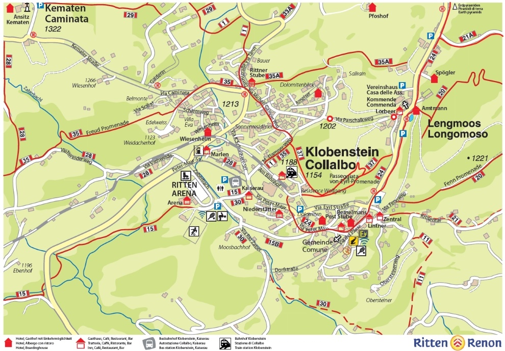Klobenstein liegt auf 1.154 Höhenmetern und ist der Hauptort am Ritten. Vom Zentrum mit der St.-Antonius-Kirche, den Geschäften, Cafés und dem Infobüro des Tourismusvereins ist es nicht weit zu einigen der schönsten Rittner Promenaden und Wanderwege. Außerdem befinden sich in Klobenstein die Ritten Arena mit ihrem umfangreichen Sportangebot und die Endstation der historischen Rittner Schmalspurbahn.