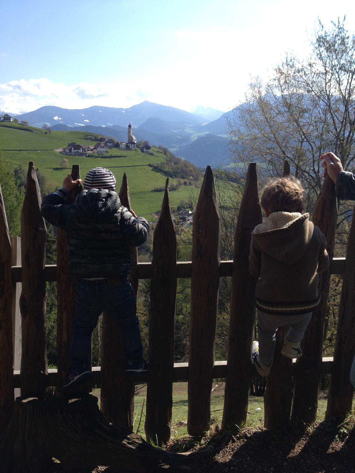 Von Oberbozen nehmen wir das Rittner Bahnl nach Klobenstein und wandern vom dortigen Bahnhof Richtung Dorfzentrum auf dem Weg 24 zu den Erdpyramiden in Lengmoos. Diesmal können wir sogar den Kinderwagen mitnehmen. Man könnte auch mit dem Auto unterhalb der Kommende Lengmoos parken und von dort starten. Zunächst geht es ein Stück der Straße entlang, aber bald schon zweigt der Weg rechts in einen schönen Wald ab. Hier geht es fast eben aus, nach ein paar Metern entdecken unsere Kinder einige Ziegen, die direkt neben dem Forstweg grasen. Man sieht sie bereits in der Ferne majestätisch über dem so genannten Finsterbachgraben thronen: die Erdpyramiden. Wir erreichen die erste Plattform und sind hin und weg: Diese Aussicht! Vor uns liegt der Schlern und das schöne Dörfchen Mittelberg mit seiner markanten Kirche. Und unten in der Schlucht diese Lehmriesen mit "Steinhut"...