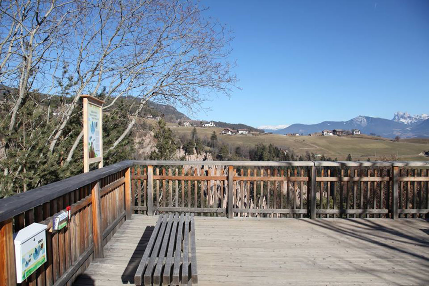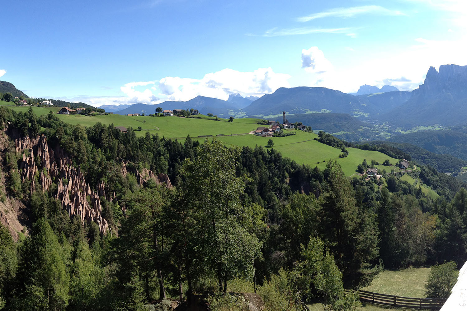 Ausgangspunkt ist die Bergstation der Seilbahn in Oberbozen. Wir orientieren uns immer am Hinweis „Erdpyramidenweg". Zuerst ein Stück auf dem Schwimmbadweg und dann durch einige Kurven geht es ein Stück bergab in den Wald und weiter zu einer großen Lichtung. Links von uns erheben sich nun an der Abbruchkante die Erdpyramiden. Schon beeindruckend diese Riesen aus Lehm. Es geht weiter bergauf über eine Wiese und in den Wald hinein, immer der Markierung nach. Mit einem tollen Ausblick auf die zackigen Gipfel von Schlern, Rosengarten und Latemar geht es schließlich bis zur Kirche von Maria Himmelfahrt und von dort zurück nach Oberbozen zur Seilbahn. Doch unser Abenteuer ist noch nicht zu Ende!