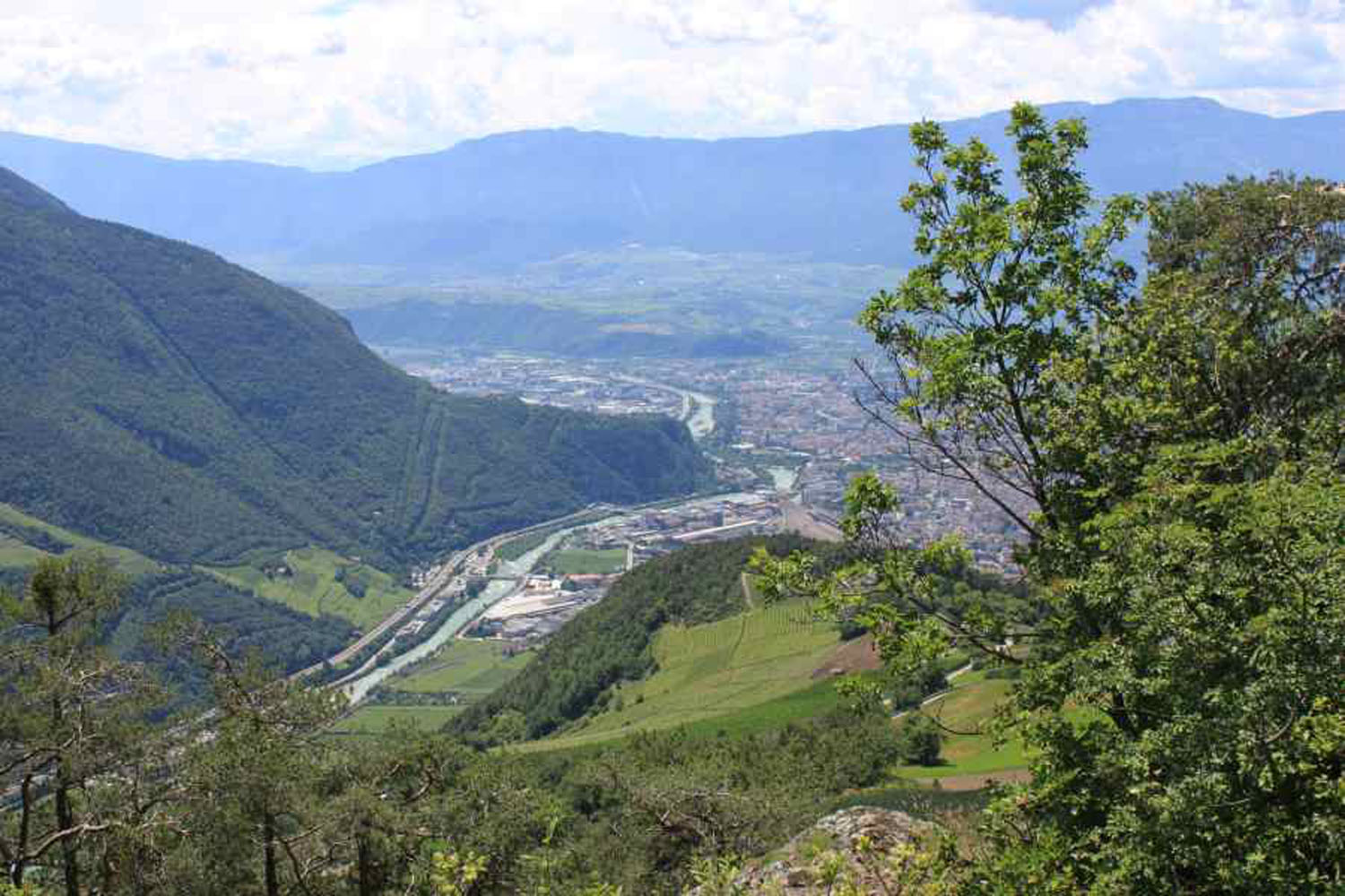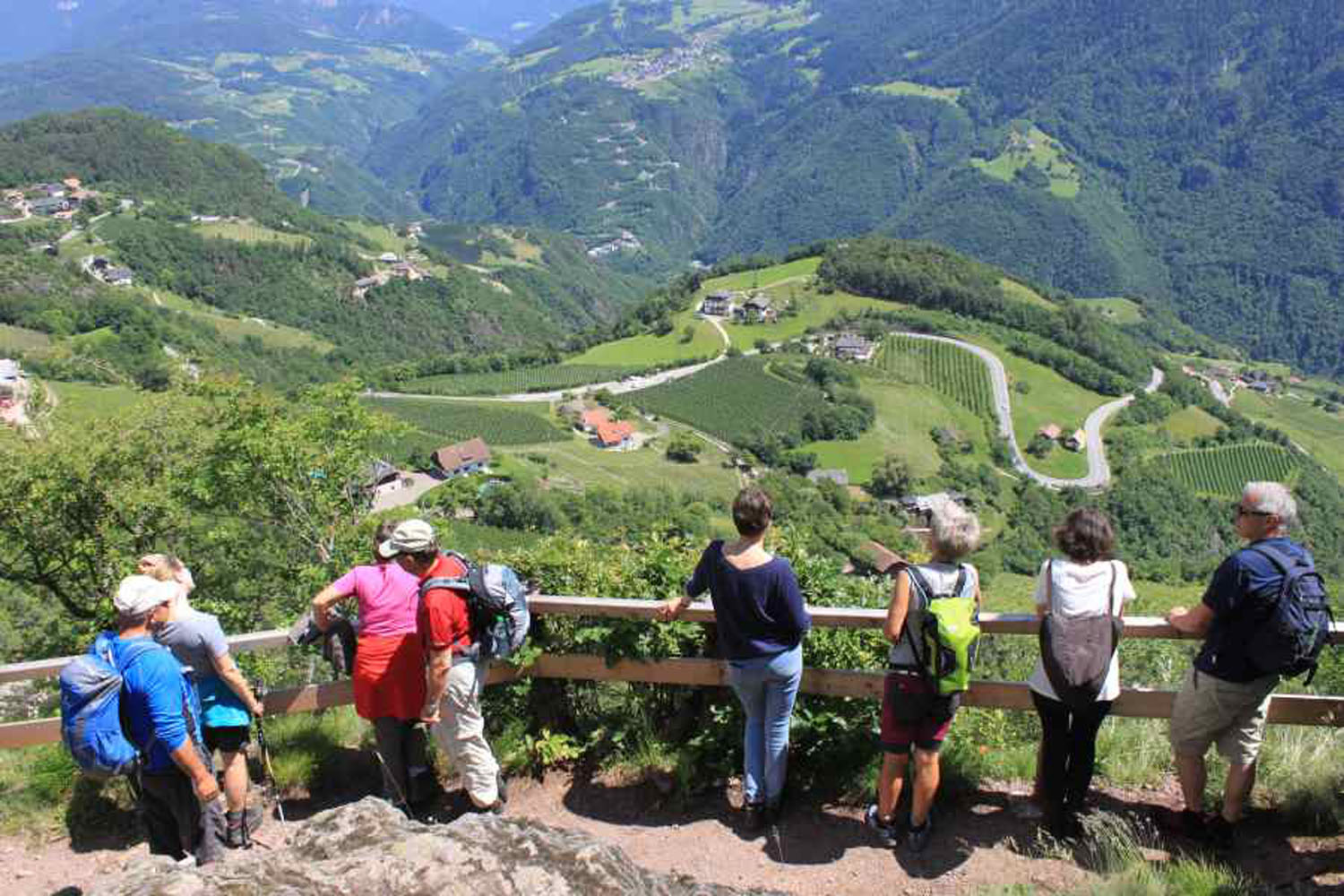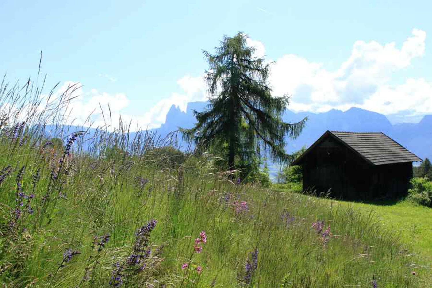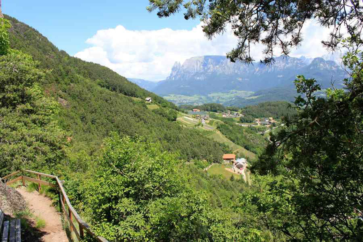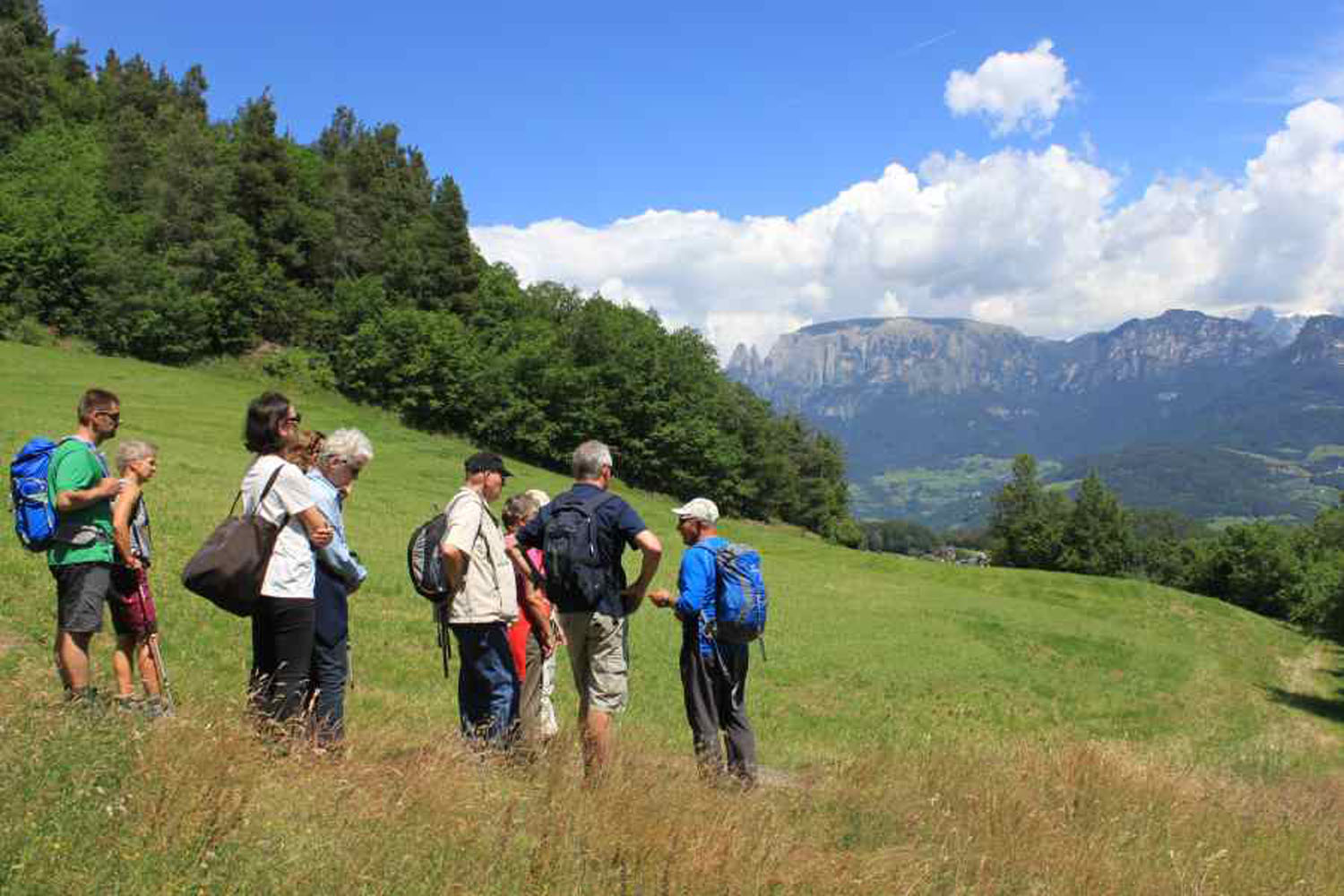 Nach kurzer Wanderung erreichen wir bereits den ersten Aussichtspunkt. Der Blick schweift weit in die Ferne zu den Bergen Schlern, Rosengarten und Co. Sepp kennt sie natürlich alle. Er ist seit vielen Jahren Wanderführer und hat neben ganz viel Wissen auch ganz viele unterhaltsame Anekdoten im Gepäck.