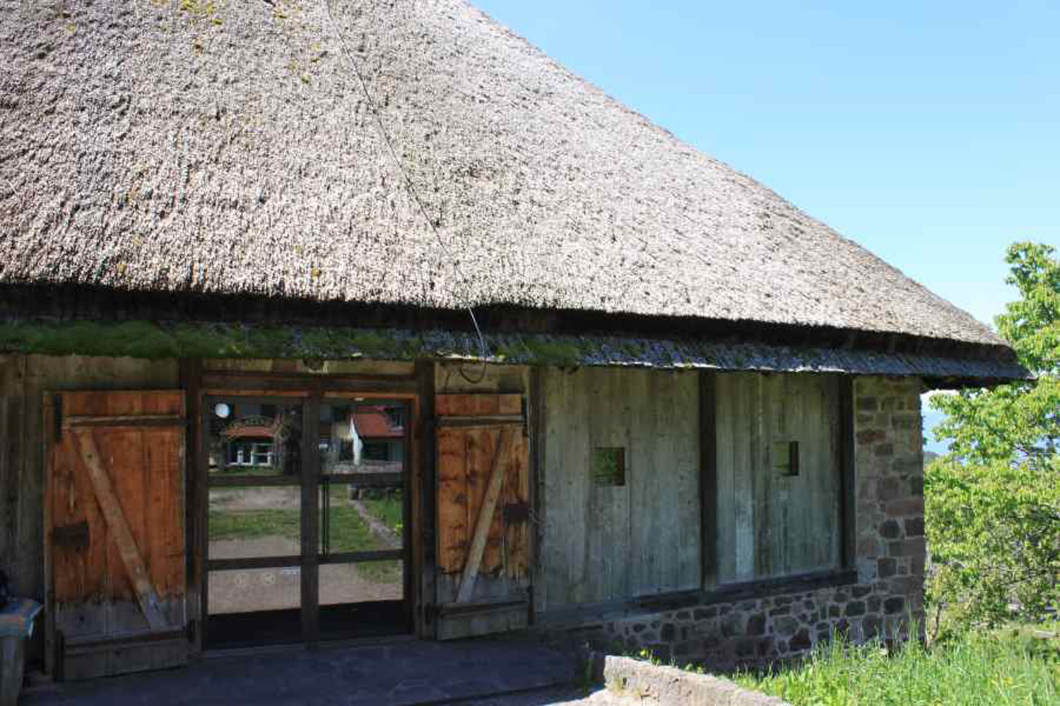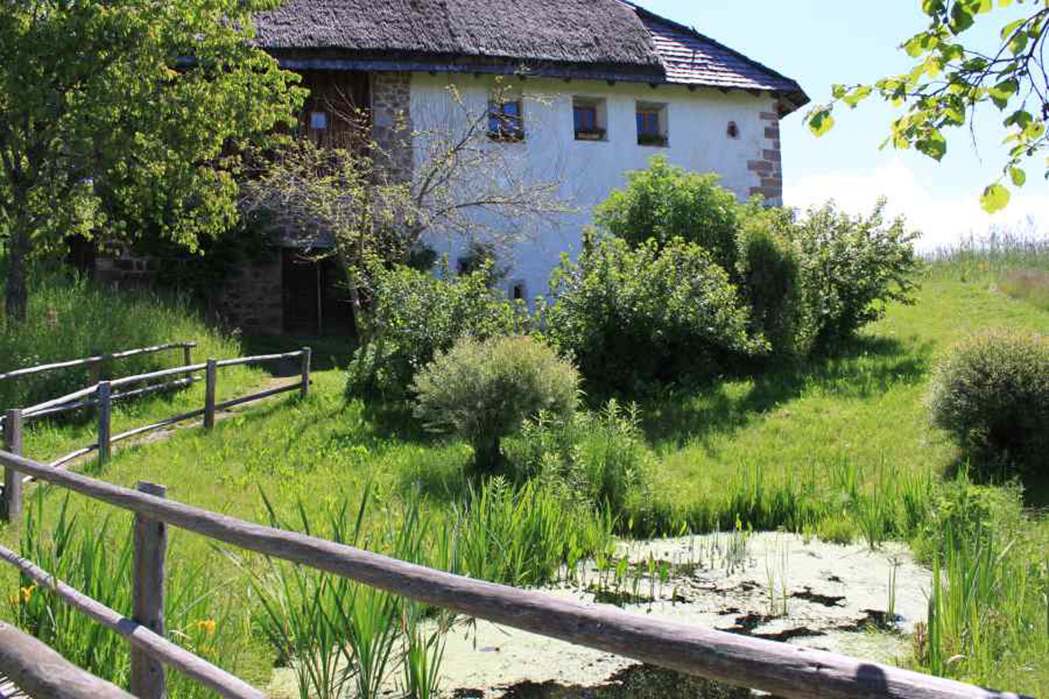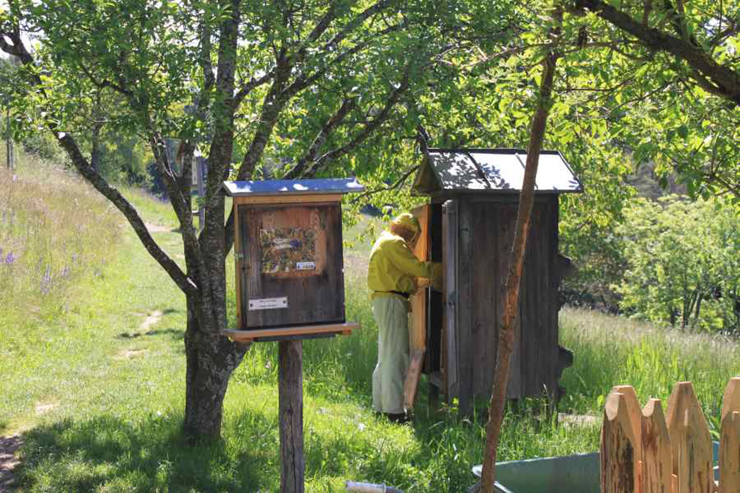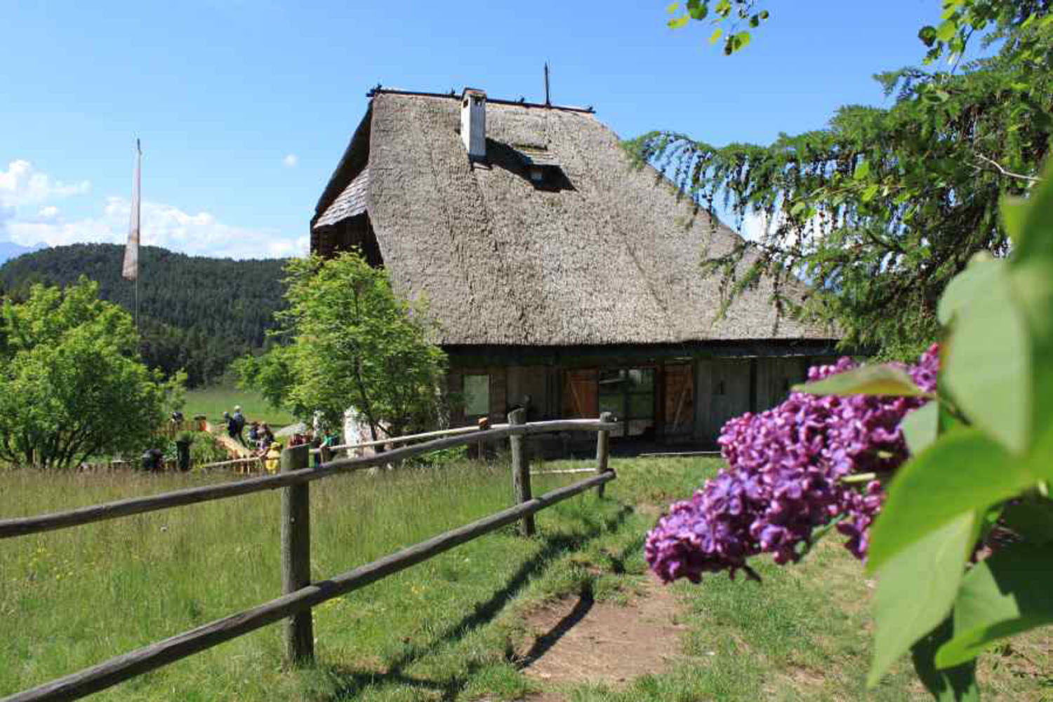 Bienenmuseum. Imker Erwin unterbricht kurz seine Arbeit und lädt uns spontan auf einen Bienenlikör ein. Wir pfeifen auf das Sprichwort „Wer rastet, der rostet“ und machen kurz Halt. Auch das ist gut für die Balance: sich Pausen gönnen. Und auf das leibliche Wohl achten. Der Ort hier ist besonders malerisch: Auf einem Hügel gelegen befindet sich ein 600 Jahre alter Hof mit einem Strohdach, das man so heute kaum mehr sieht. 150 Jahre alte Birnbäume, ein Bauerngarten mit alten Kulturpflanzen, ein kleiner Teich mit Seerosen – wie im Bilderbuch. Neben der größten Privatsammlung über die Südtiroler Imkerei gibt es auch den original erhaltenen Wohntrakt des Hofes zu besichtigen. Und auch hier wieder: dieser Blick! Vom Ortler bis zu den Dolomiten.