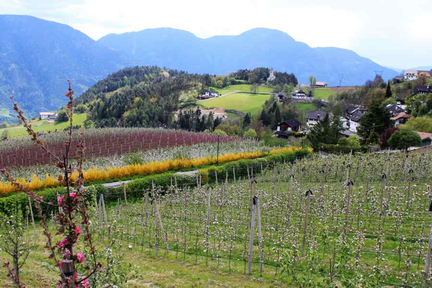 Apfelsäfte im Weinglas Neu gestärkt führt die Wanderung weiter Richtung Unterinn mit tollen Ausblicken auf Bozen. Vorbei an Apfelbäumen marschieren wir zum
