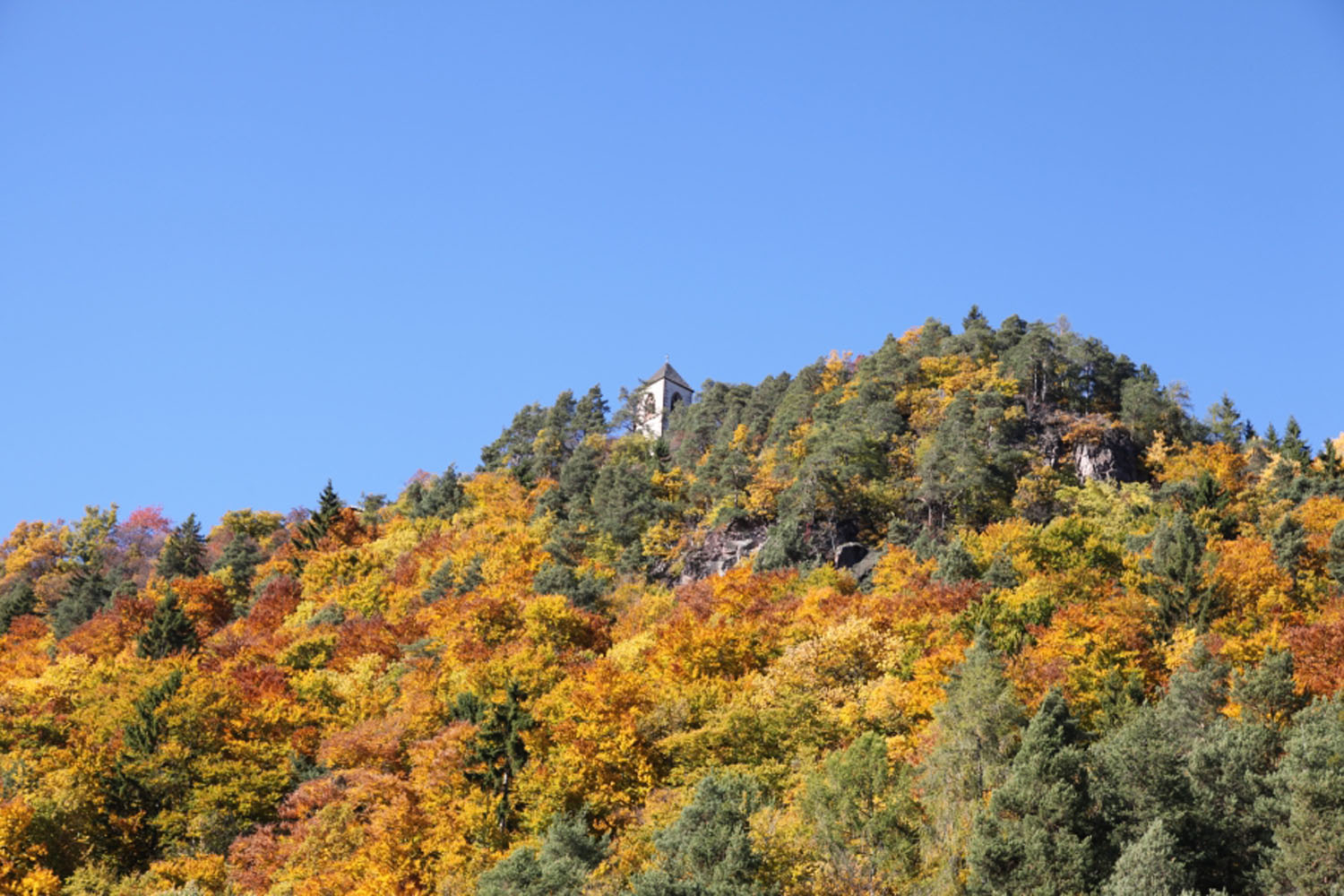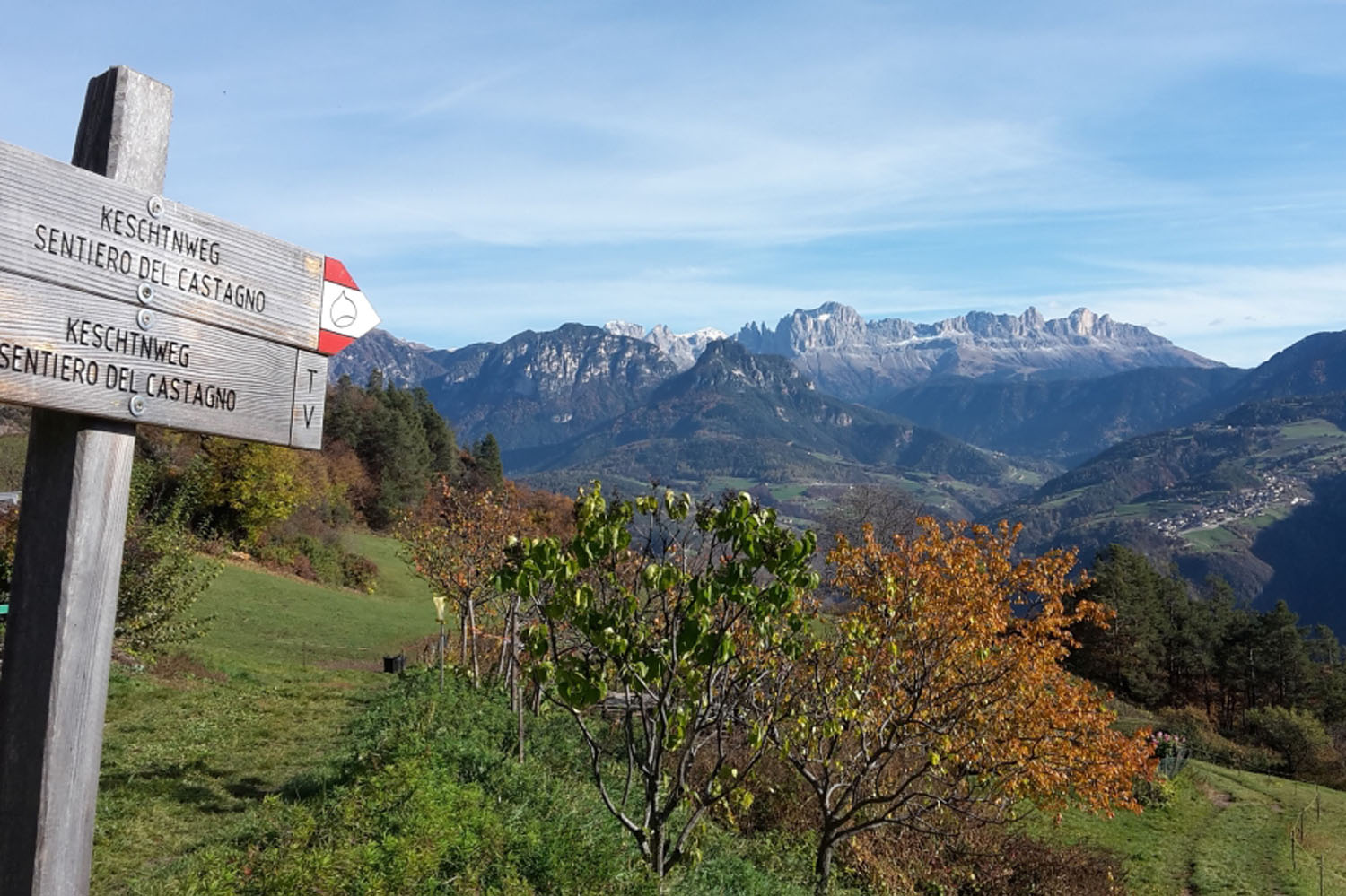 „Keschtnwegs“ der wie ein rotes Band über des Hänge des Ritten zieht. Der Herbst sorgt für angenehme Wandertemperaturen, das Laub raschelt unter den Sohlen und unterwegs kann man die eine oder andere herabgefallene Kastanie auflesen. Durch Unterinn und seine Erdpyramiden geht es durch Wiesen und Mischwälder oberhalb der Ruine Stein entlang nach Siffian.