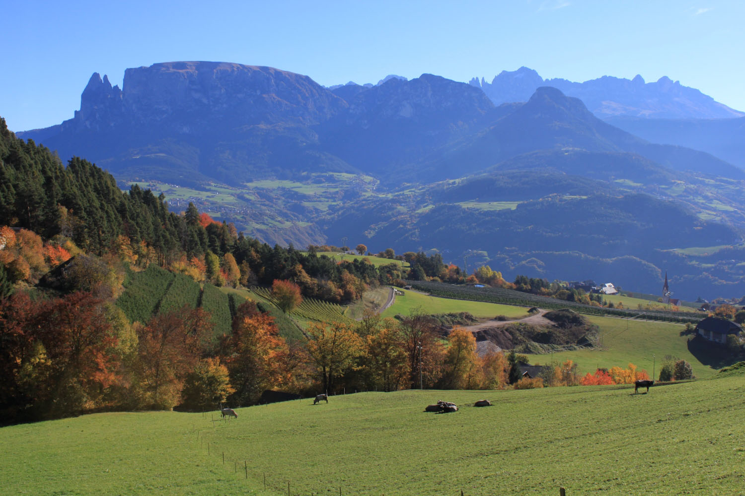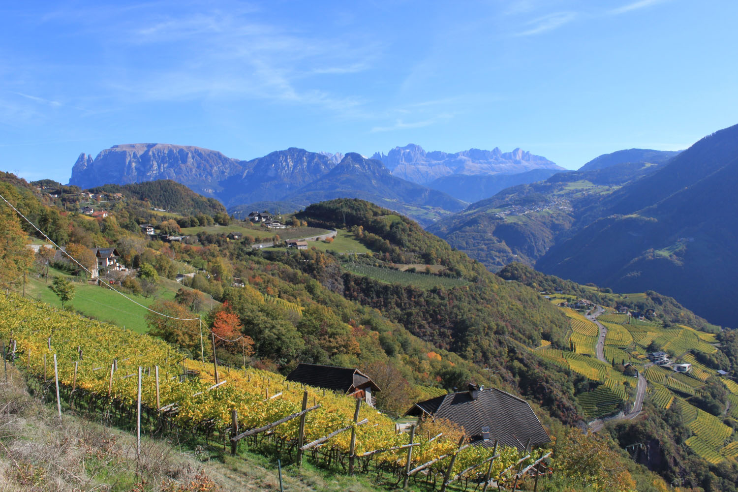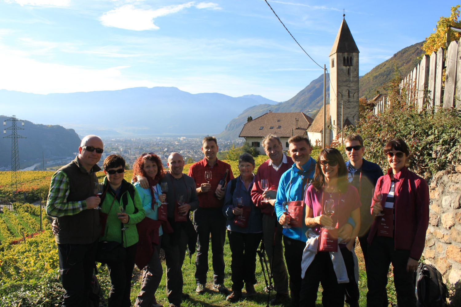 Wein, wohin das Auge reicht: Von 260 m in Bozen bis hinauf auf ca. 900 m begrüßen die Weinberge des Rittens ihre Besucher bei der Anfahrt. Unsere heutige Genusswanderung startet allerdings etwas höher: in Lichtenstern bei der Haltestelle des romantischen Bahnls. Franz Wenter ist Genussbotschafter von Südtirol und unser Wanderführer und im Gepäck hat er herrliches Kaiserwetter mitgebracht. Auch mit dabei: für jeden ein Weinglas, unverzichtbar für die bevorstehenden Weinverkostungen. Doch ohne Arbeit kein Lohn – also wird erst einmal gewandert. Es geht durch Wiesen und herrlich bunte Laubwälder vorbei am Bienenmuseum und am Wolfsgrubener See hinunter Richtung Unterinn. Der Blick über das Dorf und die dahinter liegende Bergwelt könnte schöner nicht sein: Schlern, Rosengarten, Latemar, Weiß- und Schwarzhorn grüßen uns von der Ferne. Der erste Halt ist fällig und Franz packt einen Weißburgunder aus. Der gelernte Sommelier erklärt uns, auf was wir bei einem Wein achten müssen und wie wir ihn verkosten sollen. Die Meinung der Teilnehmer ist eindeutig: Angesichts eines solchen Panoramas schmeckt der Wein noch besser als er eh schon ist.