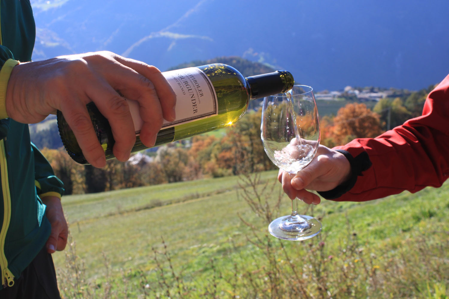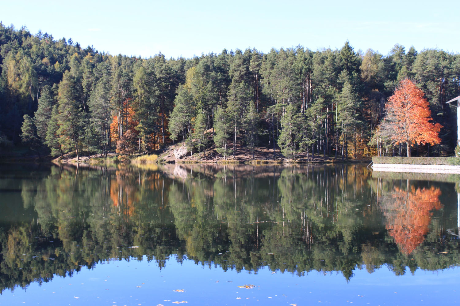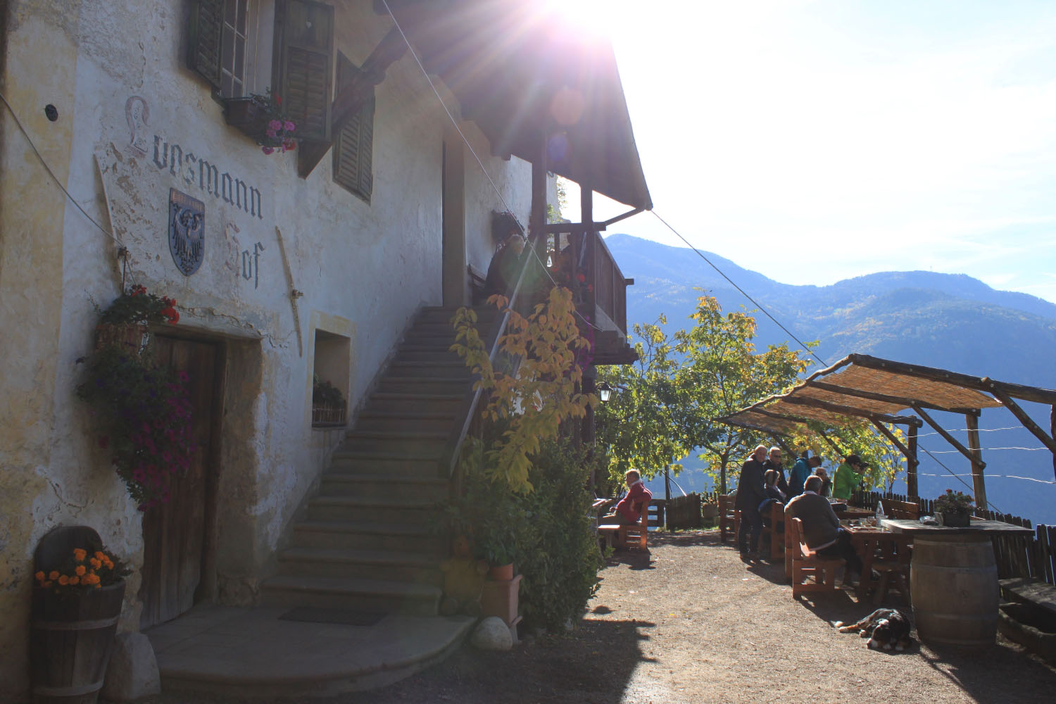 Wein, wohin das Auge reicht: Von 260 m in Bozen bis hinauf auf ca. 900 m begrüßen die Weinberge des Rittens ihre Besucher bei der Anfahrt. Unsere heutige Genusswanderung startet allerdings etwas höher: in Lichtenstern bei der Haltestelle des romantischen Bahnls. Franz Wenter ist Genussbotschafter von Südtirol und unser Wanderführer und im Gepäck hat er herrliches Kaiserwetter mitgebracht. Auch mit dabei: für jeden ein Weinglas, unverzichtbar für die bevorstehenden Weinverkostungen. Doch ohne Arbeit kein Lohn – also wird erst einmal gewandert. Es geht durch Wiesen und herrlich bunte Laubwälder vorbei am Bienenmuseum und am Wolfsgrubener See hinunter Richtung Unterinn. Der Blick über das Dorf und die dahinter liegende Bergwelt könnte schöner nicht sein: Schlern, Rosengarten, Latemar, Weiß- und Schwarzhorn grüßen uns von der Ferne. Der erste Halt ist fällig und Franz packt einen Weißburgunder aus. Der gelernte Sommelier erklärt uns, auf was wir bei einem Wein achten müssen und wie wir ihn verkosten sollen. Die Meinung der Teilnehmer ist eindeutig: Angesichts eines solchen Panoramas schmeckt der Wein noch besser als er eh schon ist.