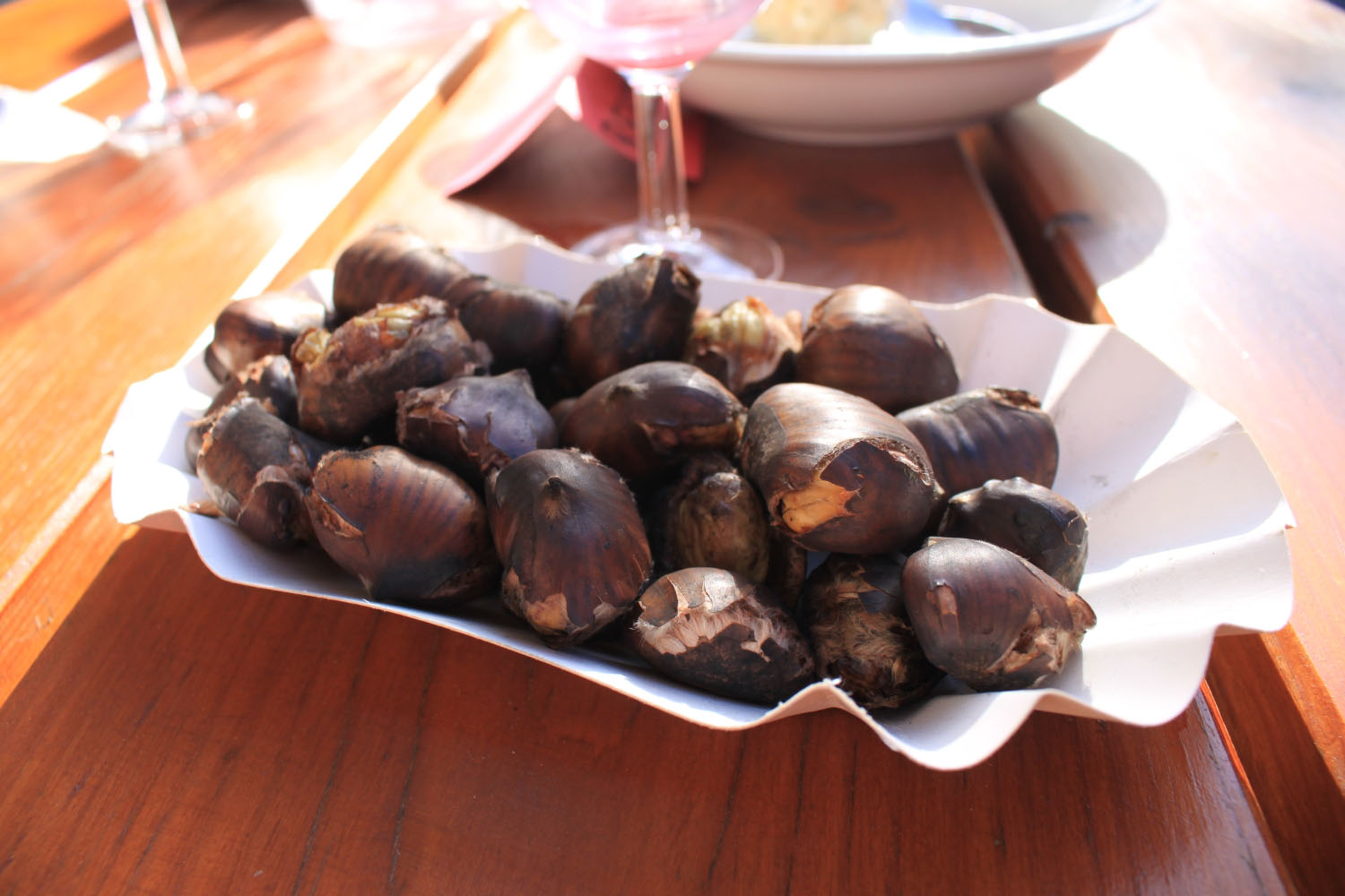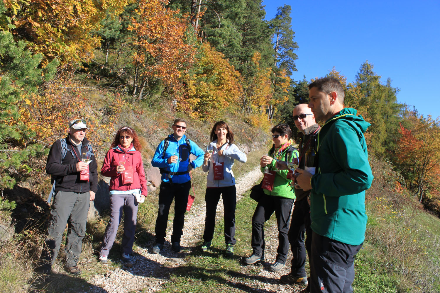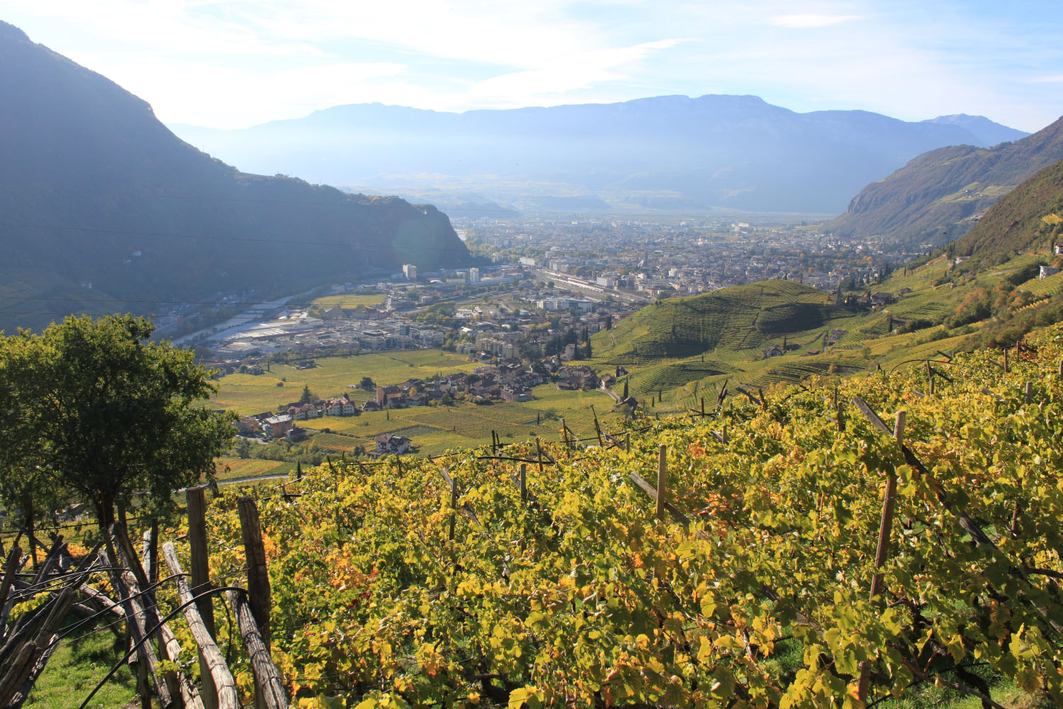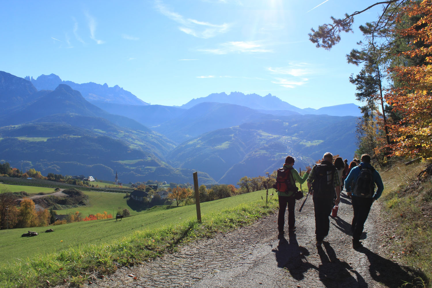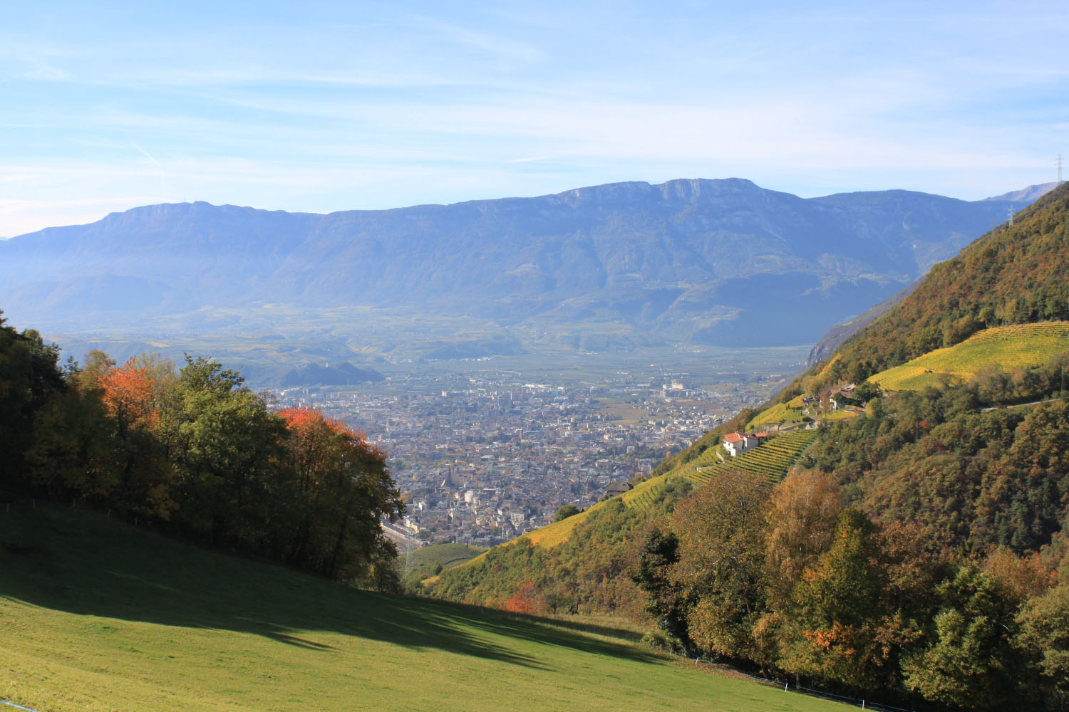 Weitwandern auf dem Keschtnweg Weiter geht es durch Wald, das Laub raschelt unter unseren Füßen, die Sonne schafft eine magische Atmosphäre, die ersten Kastanienbäume kreuzen unseren Weg und schließlich gelangen wir auf den berühmten „Keschtnweg“. Bei einem zweiten Glas Weißwein, diesmal einem Müller Thurgau, verrät uns Franz, wie man erkennt, ob eine Edelkastanie süß ist oder nicht und erzählt uns vom Apfelanbau am Ritten. Dann ändert sich die Landschaft und zahlreiche Weinreben säumen unseren Weg. Ihre gelben Blätter erzeugen einen herrlichen Kontrast zum Blau des Himmels und mittlerweile heizt die Sonne kräftig ein. Wir erreichen Signat, wo wir uns beim Loosmann Hof bei köstlichen Bauerngerichten stärken. Wir sitzen auf rustikalen Holzbänken, trinken Wein oder Most und genießen das umwerfende Panorama auf Bozen.