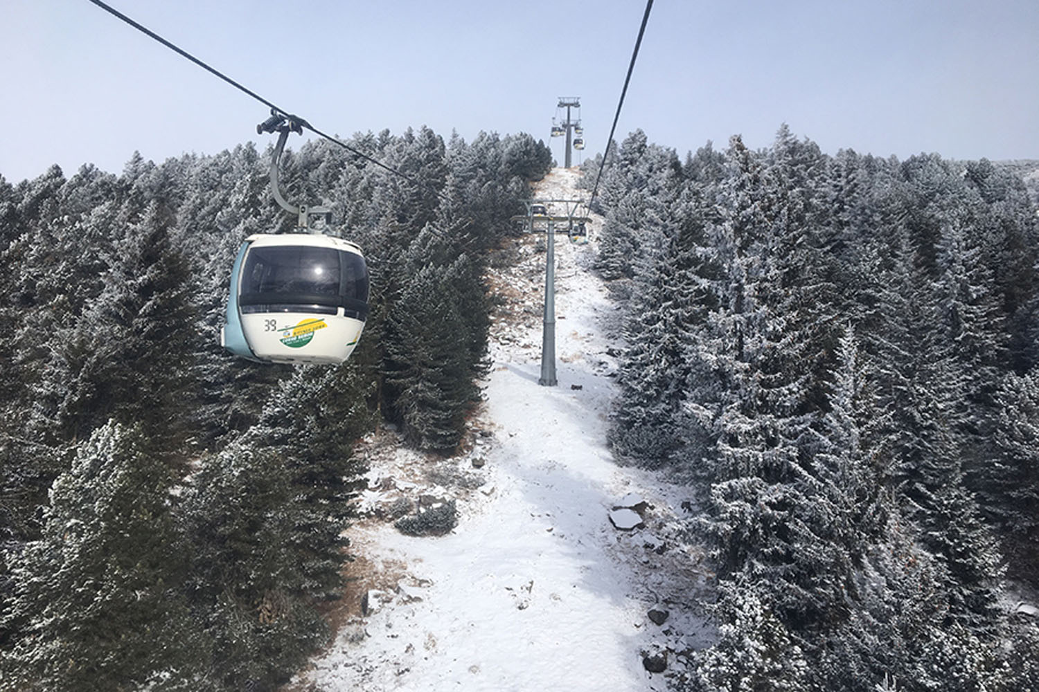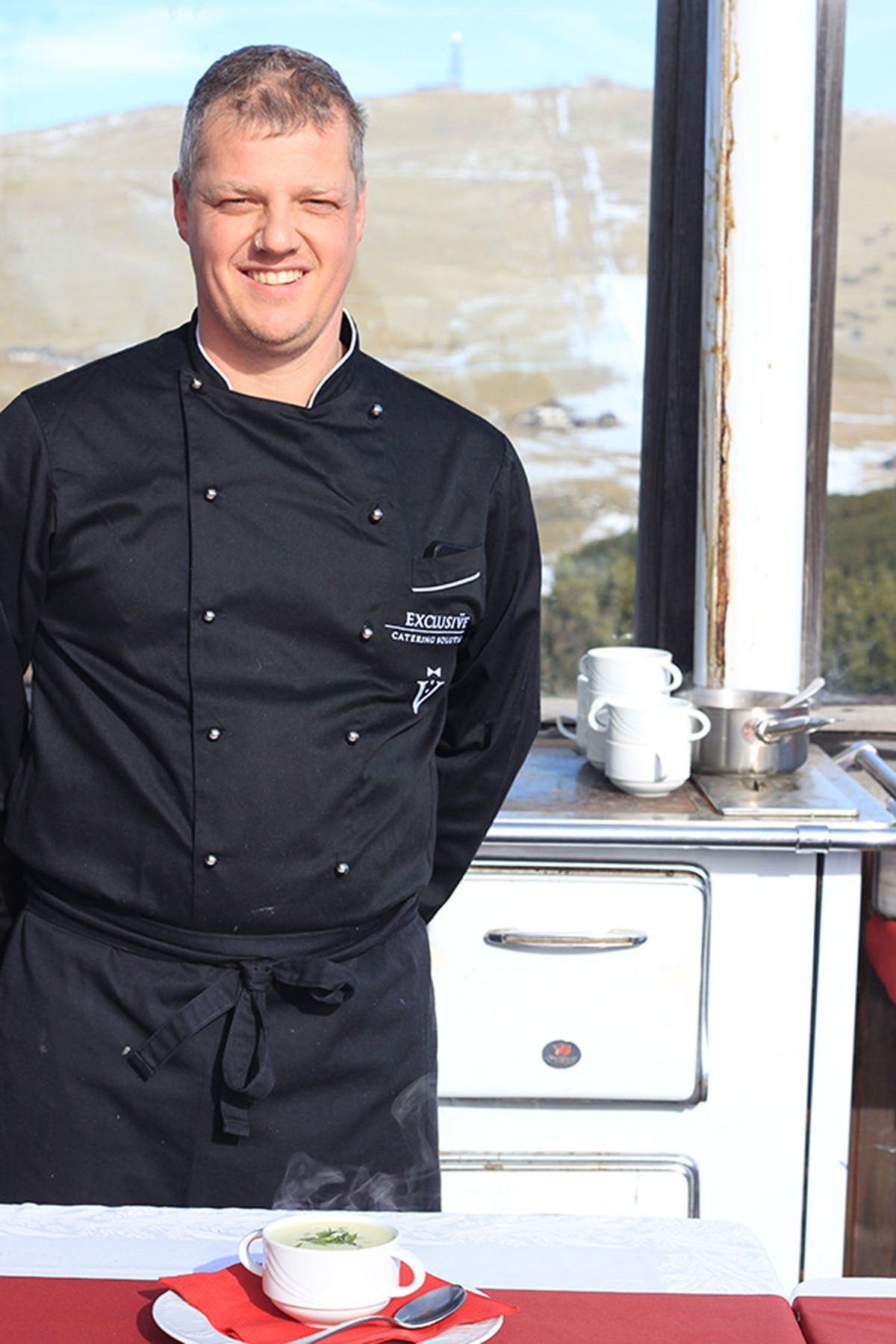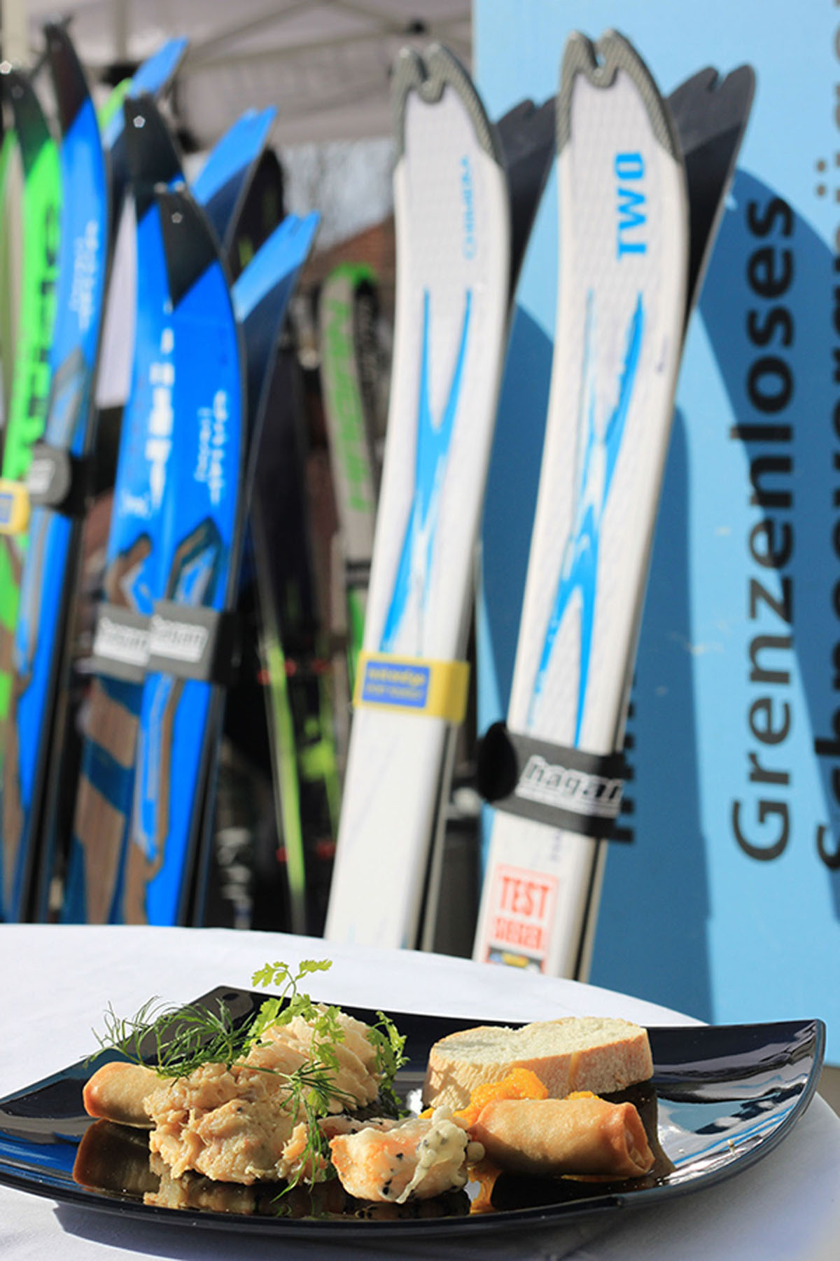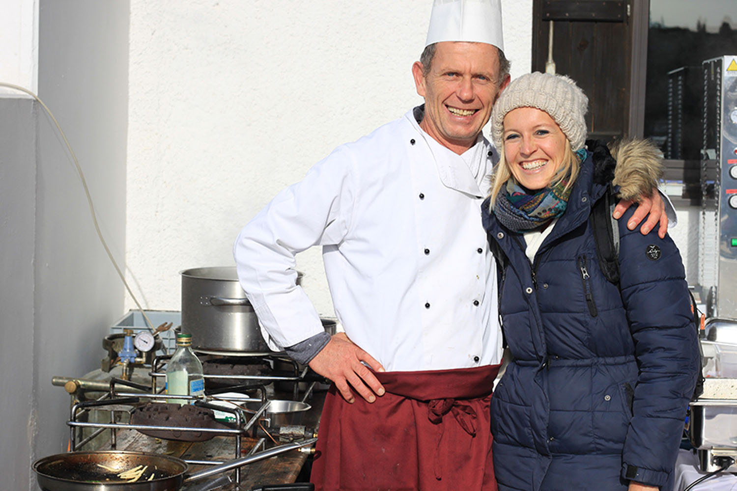Ich nehme die Bergbahn und wenige Minuten später bin ich oben auf der Schwarzseespitze und genieße das traumhafte Panorama. Auch hier wurde eine provisorische Küche aufgebaut und neben den offenen Feuerstellen hilft mir die hier servierte Vorspeise mich aufzuwärmen: