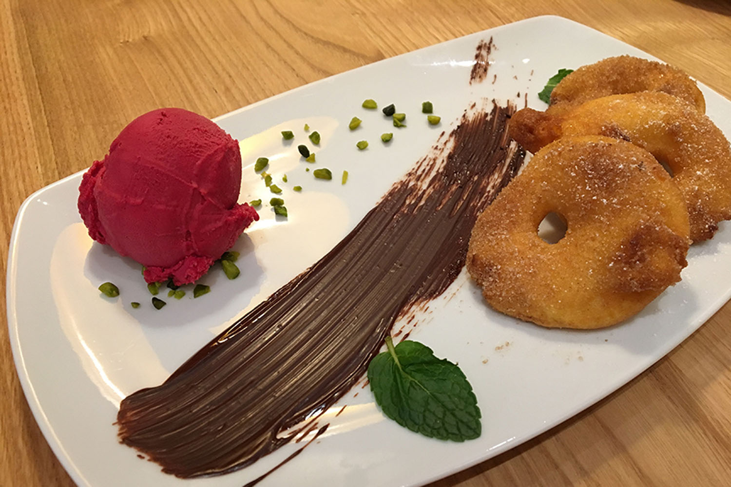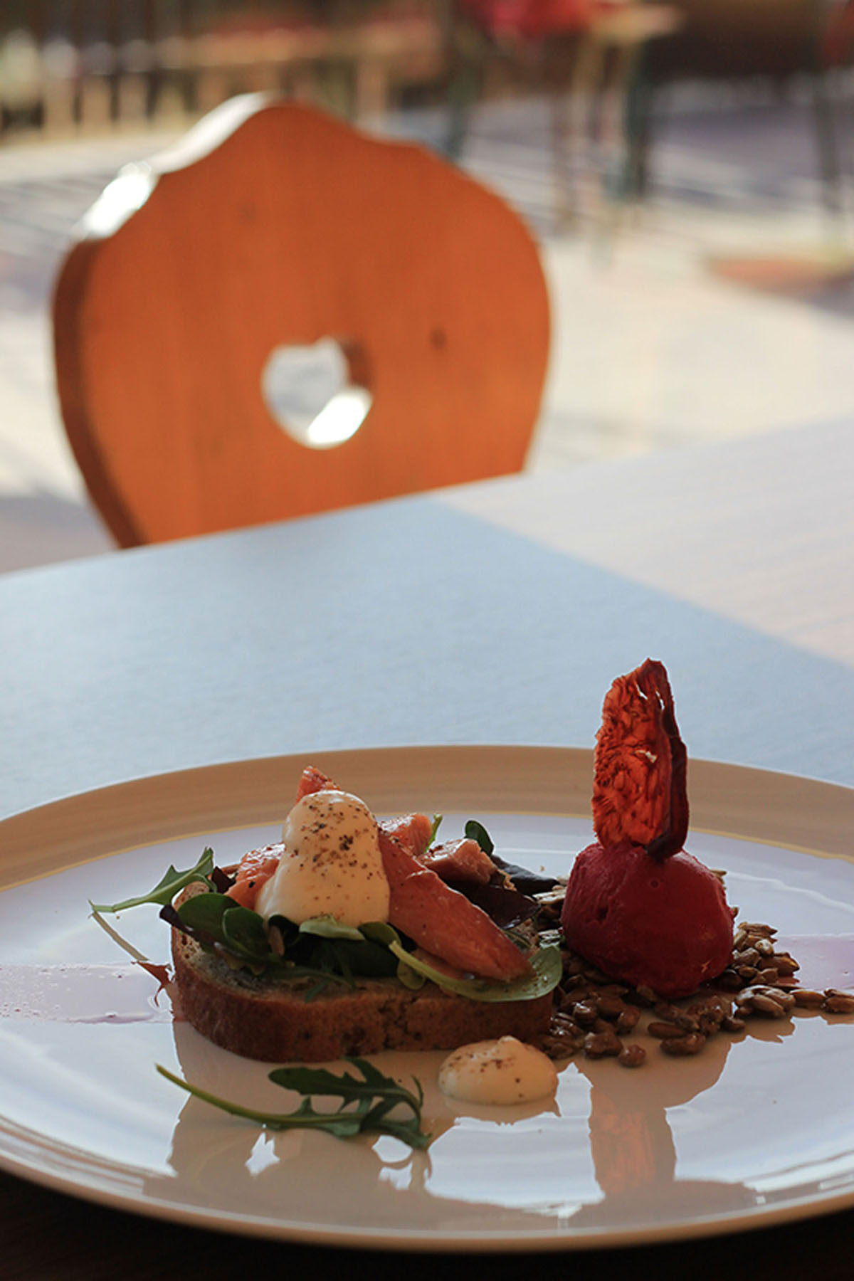 - Rittner Kloatze Brotschnitte mit winterlichem Salat und geräuchertem Forellenfilet, Meerrettichsauce, Rote Bete Passionsfruchtsorbet mit karamellisierten Sonnenblumenkernen.