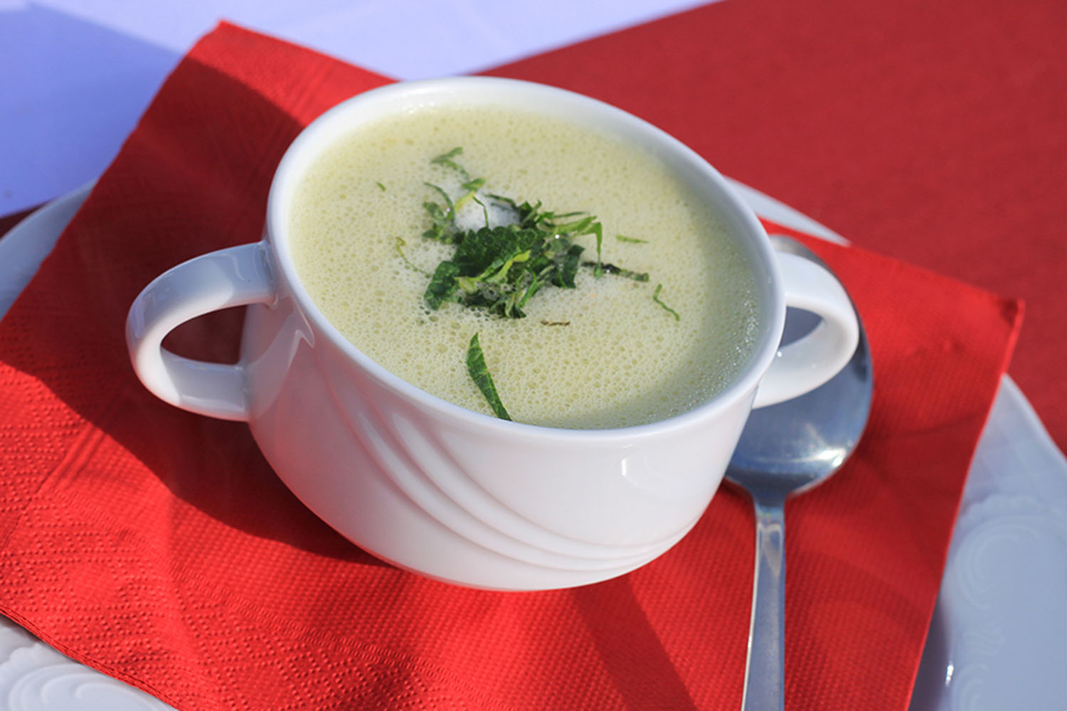 - Erbsenschaumsüppchen mit Minze und Flusskrebsen.