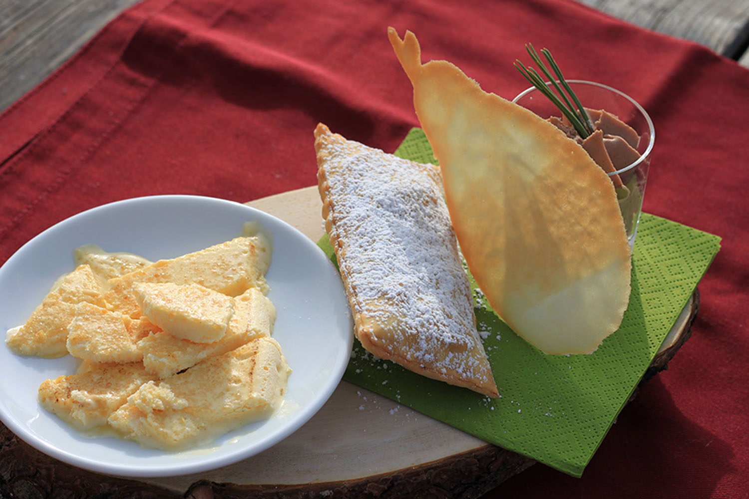 - Schokolade-Latschen-Mousse, geeister Kaiserschmarrn und kleiner Rittner Kirchtagskrapfen mit Rittner Kloatzen-Kürbisfülle.