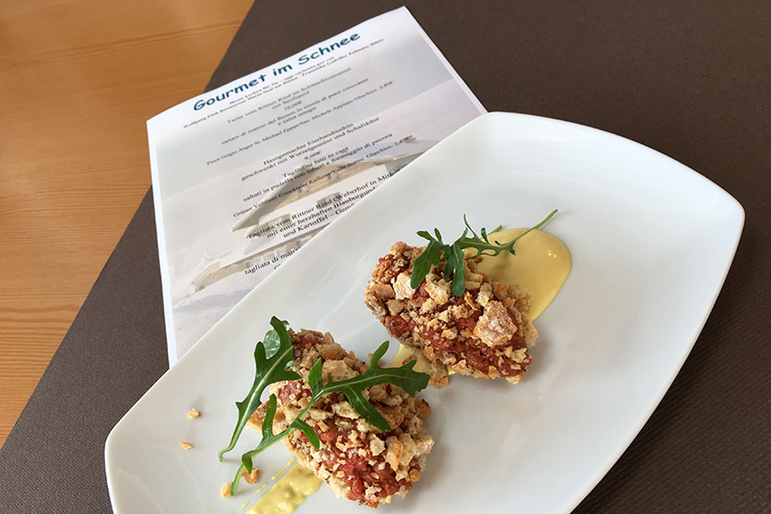 Feltuner Hütte am Rittner Horn wird. Wie immer werden wir dort freundlich empfangen. Der Service hier ist wirklich hervorzuheben und macht die Hütte sehr beliebt. Entspannt werden wir alle vier Gänge durchkosten: beim Tatar im Schüttelbrotmantel angefangen über die hausgemachten Eierbandnudeln, die Tagliata vom Rittner Rind bis hin zu den Apfelscheiben mit Rote-Bete-Passionsfrucht-Eis. Alles wirklich sehr gut! Also auf zum nächsten "Gourmet im Schnee".