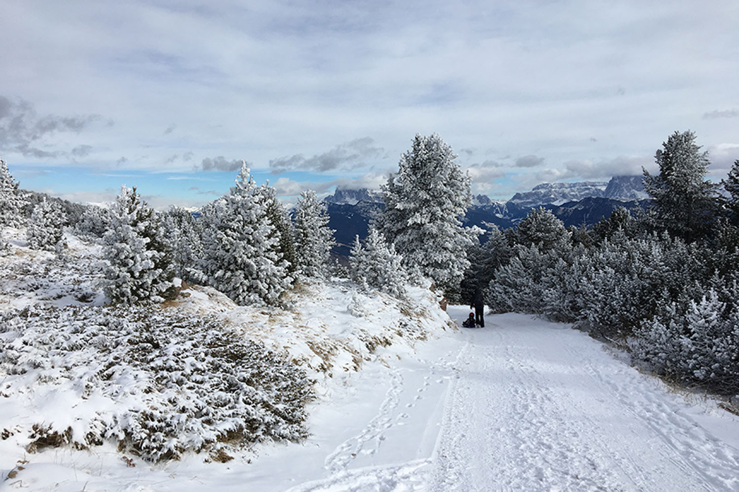Mit vollem Magen mache ich mich auf zur letzten Station. Dafür wandere ich ein Stück entlang der Premium-Panorama-Tour, hinauf zum Schofstoll beim Schutzhaus des Rittner Horn. Für jegliche Strapaze wird man hier mit einer wunderbaren Dessertkreation entschädigt: