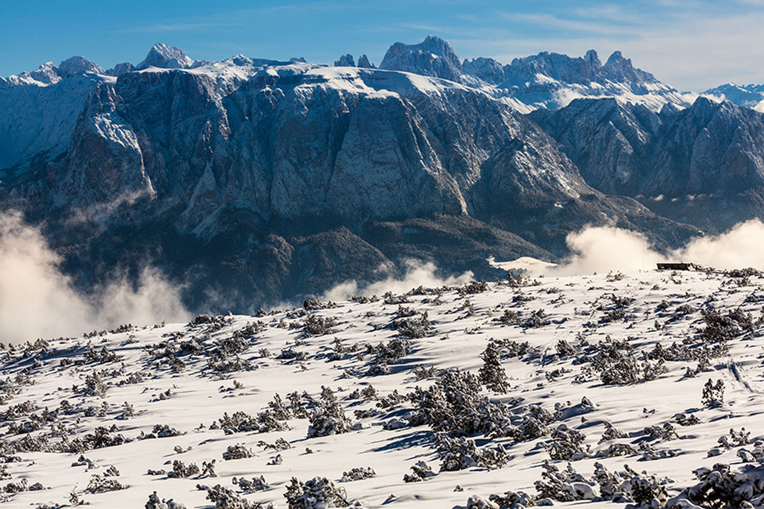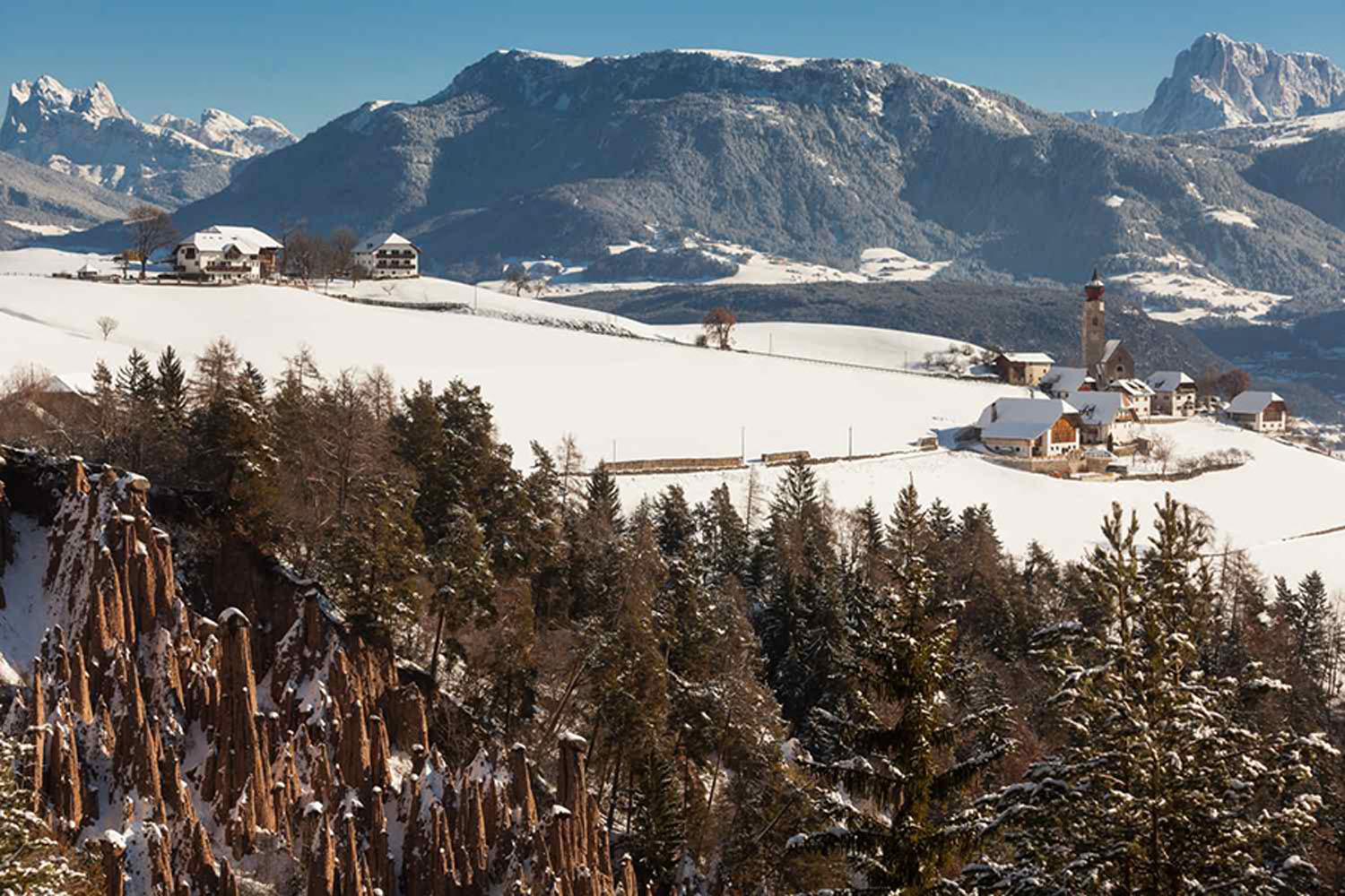 Die Strahlen der Sonne brechen durch die Latschen. So ruhig, so friedlich liegt sie da, die Südtiroler Bergwelt, kalt und Herz erwärmend zugleich. Wer die Seele baumeln lassen, frische Bergluft atmen und die herrliche Naturkulisse der Dolomiten genießen möchte, begibt sich am besten auf eine Winterwanderung, fernab der hektischen Skipisten. Denn wer sich selbst sucht, der findet sich hier, irgendwo zwischen Wald, Wiese und Gipfel. Über 300 Kilometer Wanderwege stehen am Ritten zur Auswahl. Für wirklich jede Kondition findet sich hier der richtige Weg.