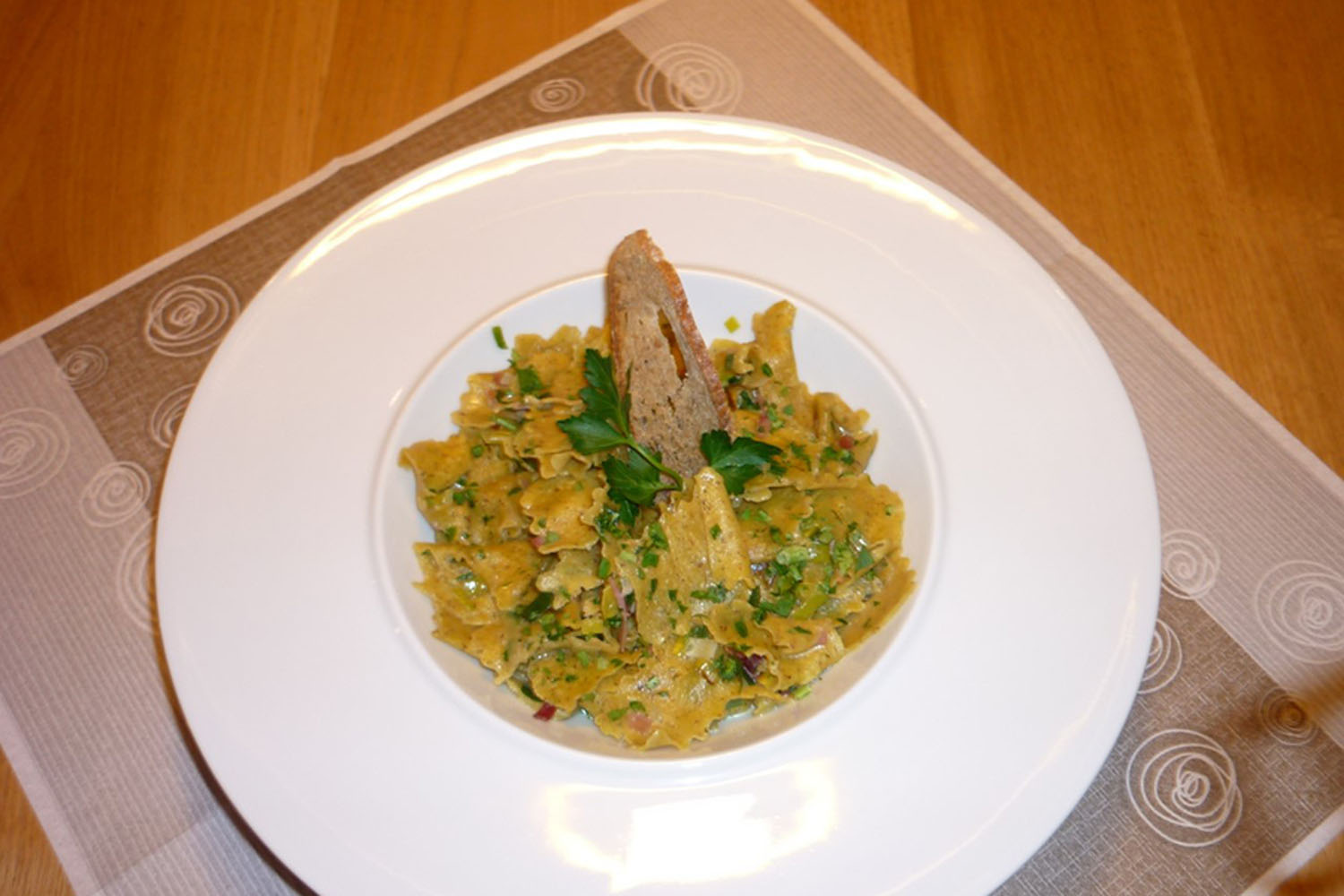 Buchweizenbandnudel mit Lauch und Speckstreifen – Rezept von der Feltunerhütte