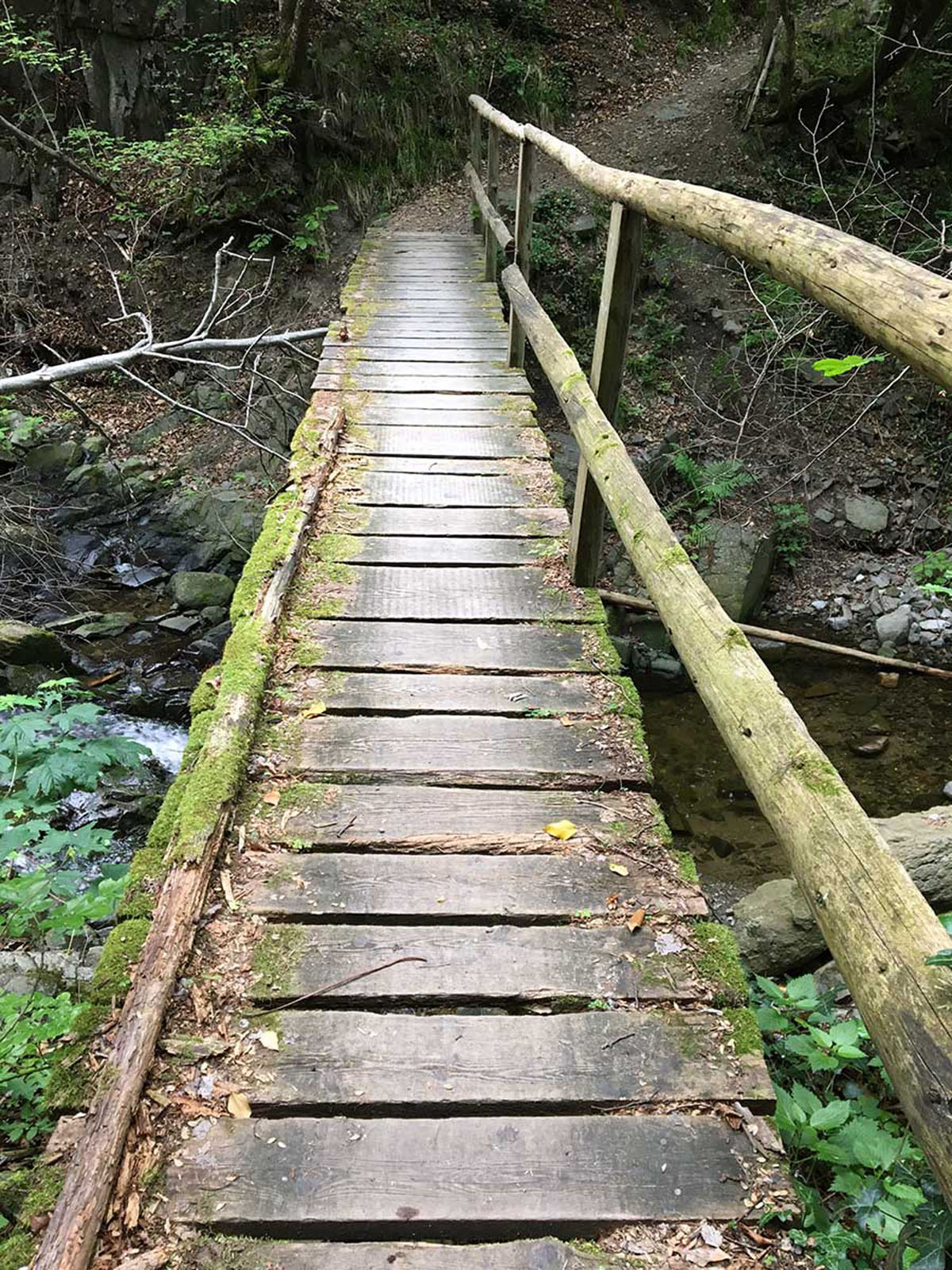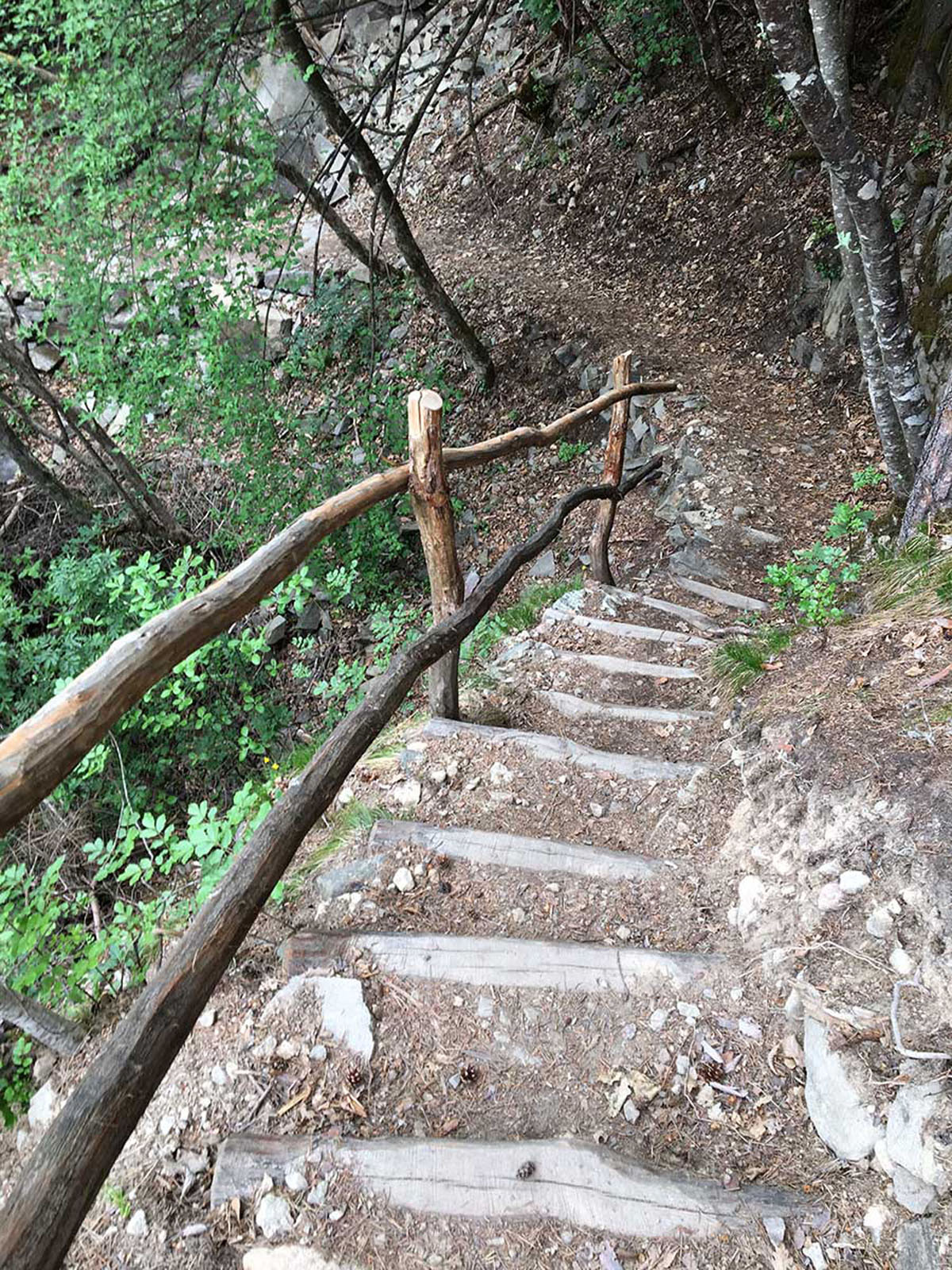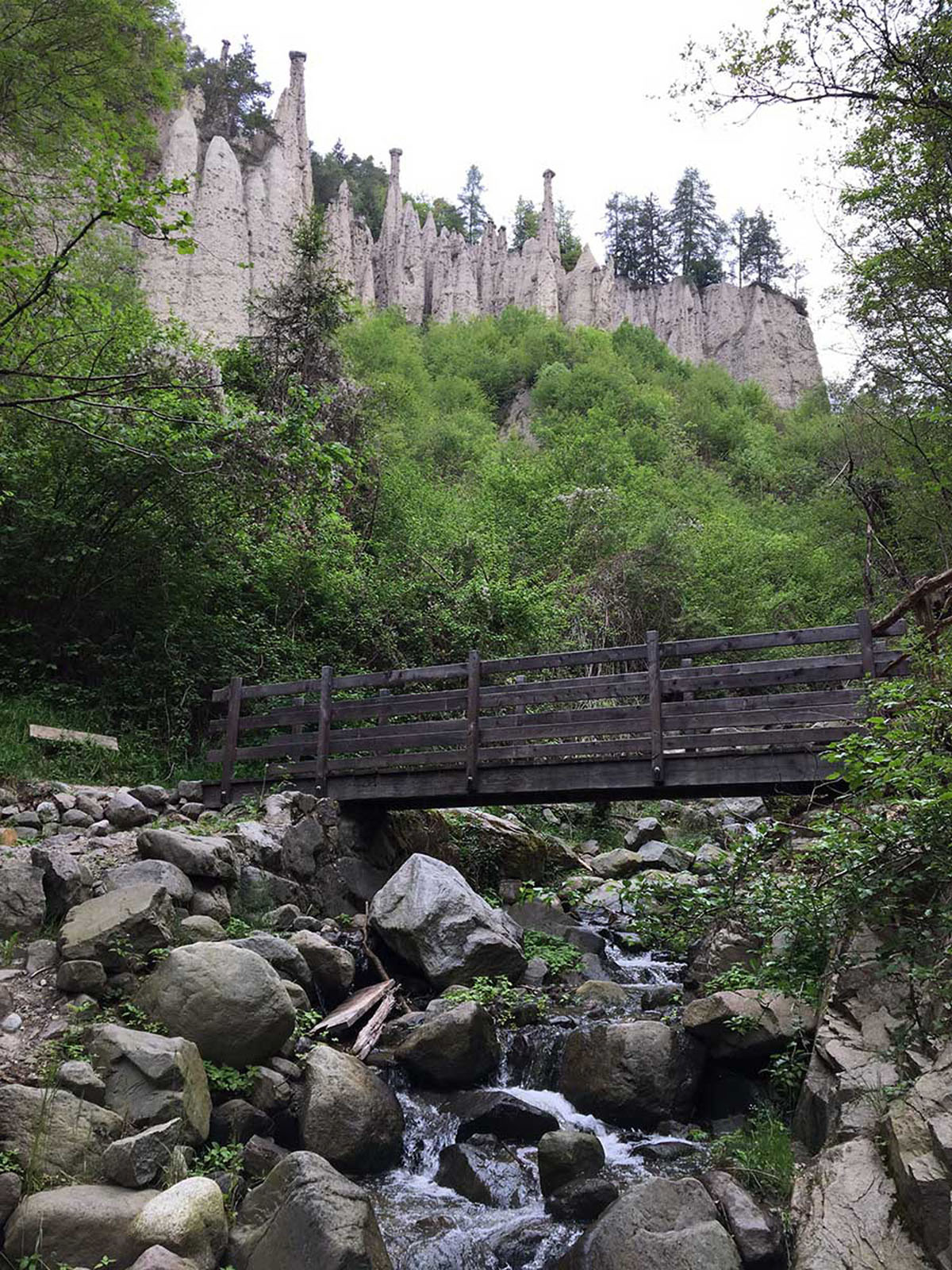 Beim kleinen Bach erhaschen wir einen Blick auf die Erdpyramiden und kurz darauf zeigt uns ein Wegweiser die Abzweigung zur Aussichtsplattform an. Es geht steil hinauf, aber nach etwa drei Minuten sind wir schon da und stehen ganz nah vor dem Naturwunder.
