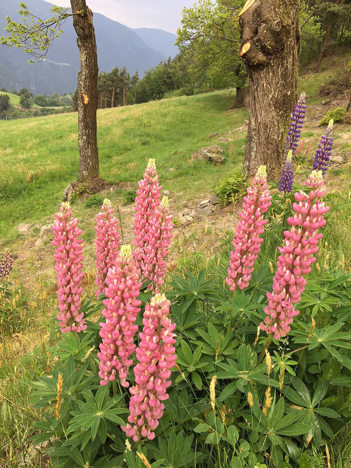 Danach geht es weiter auf dem Keschtnweg, am Bliemler und Tasegger Hof vorbei. Dass der Weg nicht nur zur Törggelezeit, sondern auch im Frühjahr reizvoll ist, beweisen die schönen Blumen, die man am Wegrand findet oder die wunderbare Blüte eines Kastanienhains... Immer wieder öffnet sich der Blick auf den Schlern und das Eisacktal. Dann geht es steil hinunter zum Stegerbach, wir überqueren eine Holzbrücke und anschließend geht der Steig wieder bergauf. Die Weinberge des Rielingerhofs sind schon in Sichtweite. Bis hierher sind es etwa 3,5 Kilometer mit etwa 140 Höhenmetern. Der Rückweg ist wie der Hinweg oder man geht hinauf zum Ort Klobenstein und nimmt den Bus zurück nach Unterinn oder mit der Rittner Trambahn nach Oberbozen und mit der Rittner Seilbahn nach Bozen. Man kann die Wanderung auch bis nach Lengstein fortsetzen und mit dem Bus 165 stündlich zurückfahren.