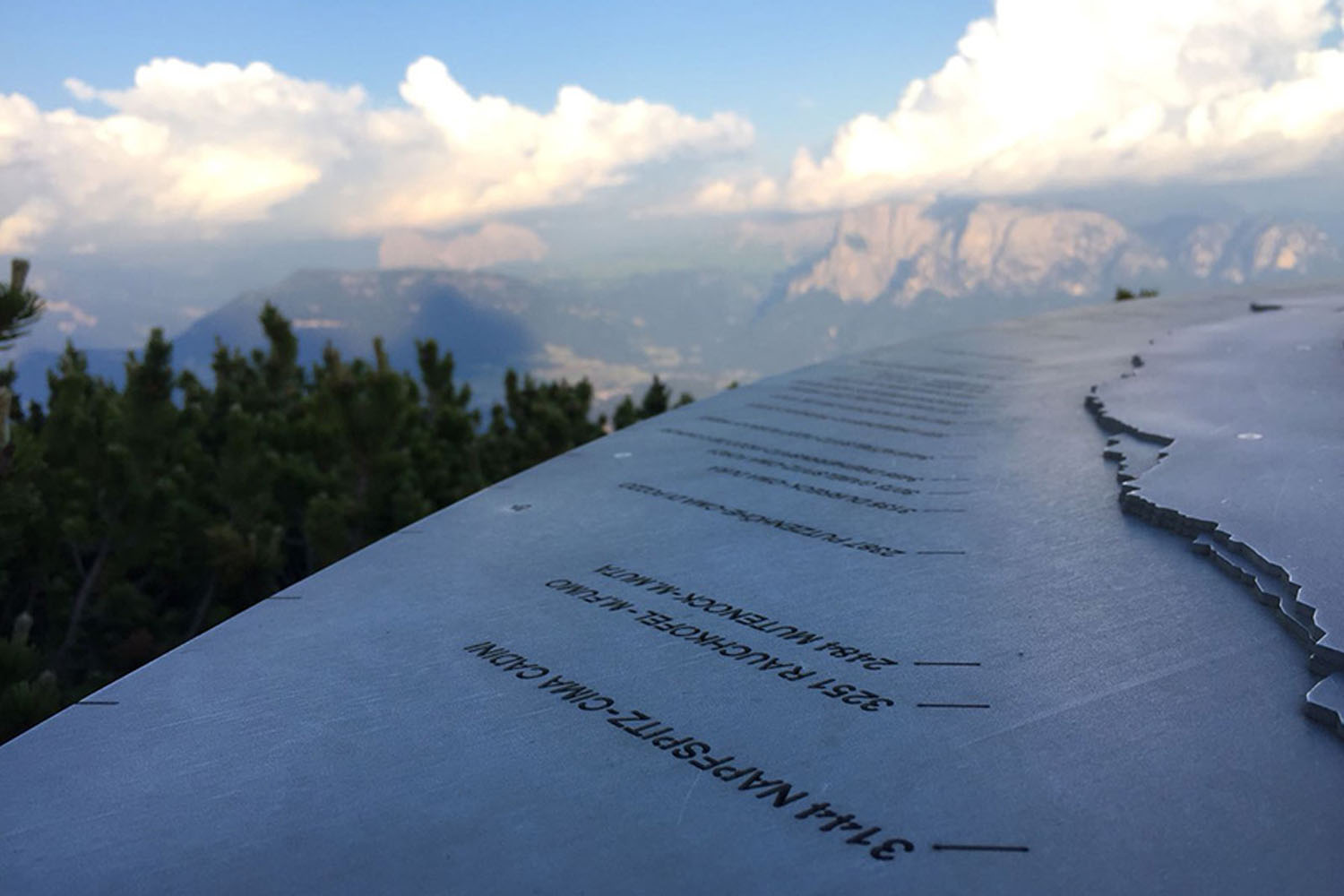 Von der Schwarzseespitze geht’s weiter aufs Rittner Horn. Mit dem 360° Panorama auf die umliegenden Berggipfel fallen uns auch die letzten Höhenmeter nicht schwer. Nach einer kleinen Pause, natürlich mit Gipfelbussi und einem „Stamperle“ Schnaps, wandern wir bergab und lassen uns den Panoramaweg mit dem Runden Tisch nicht entgehen. Dort wird über die Benennung der Berge und Gipfel lautstark diskutiert. Santner oder Euringer? Tschafon oder Hammerwand? Zum Glück gibt uns der Runde Tisch die fehlenden Antworten.