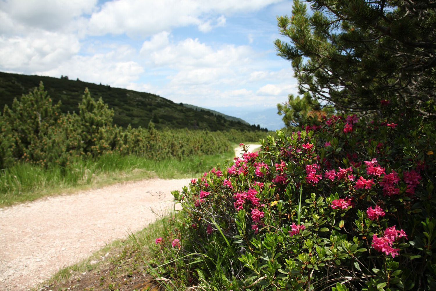 Doch nicht nur die Fernsicht lässt uns staunen, auch der Ausblick direkt um uns herum fasziniert uns sehr. Ein traumhaftes pink-rosa Blütenmeer. Die Alpenrosen am Rittner Horn stehen in voller Blüte und lassen uns unseren Ausflug noch traumhafter erscheinen…
