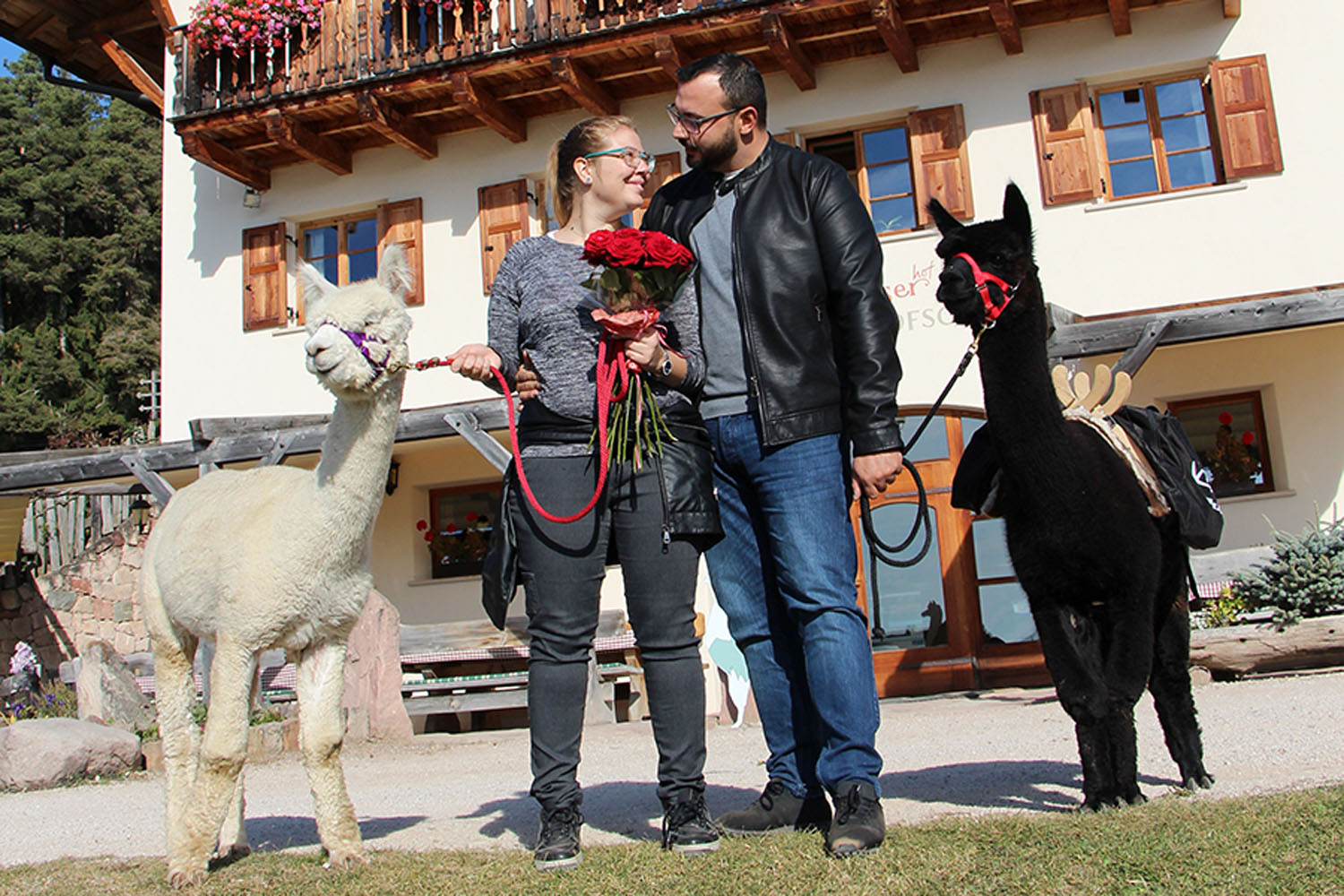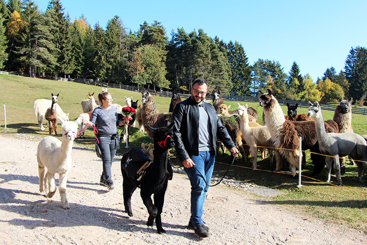 Vor kurzer Zeit bekam Walter Mair vom Kaserhof eine nicht alltägliche, ja eine romantische Anfrage. Zwei seiner Alpakas sollten sich als Liebesbotschafter auf den Weg machen. Mit diesen Tieren wollte Alessandro aus Rom seiner Freundin Sevi einen ganz besonderen Heiratsantrag machen.