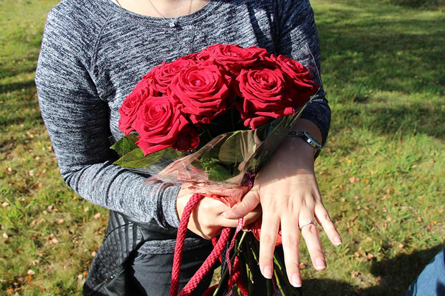 Ganz begeistert von ihren tierischen Begleitern spazierten Sevi und Alessandro durch den herbstlichen Wald. An einer Wiese angekommen schickte Alessandro seine Freundin voraus. Was sie nicht wusste war, dass hinter einem kleinen Hügel ein wunderschöner Strauß Rosen auf sie wartet. Gleichzeitig hatte Alessandro genug Zeit, eine goldene Schachtel in Herzform um den Hals von Apollo de Oro zu binden.