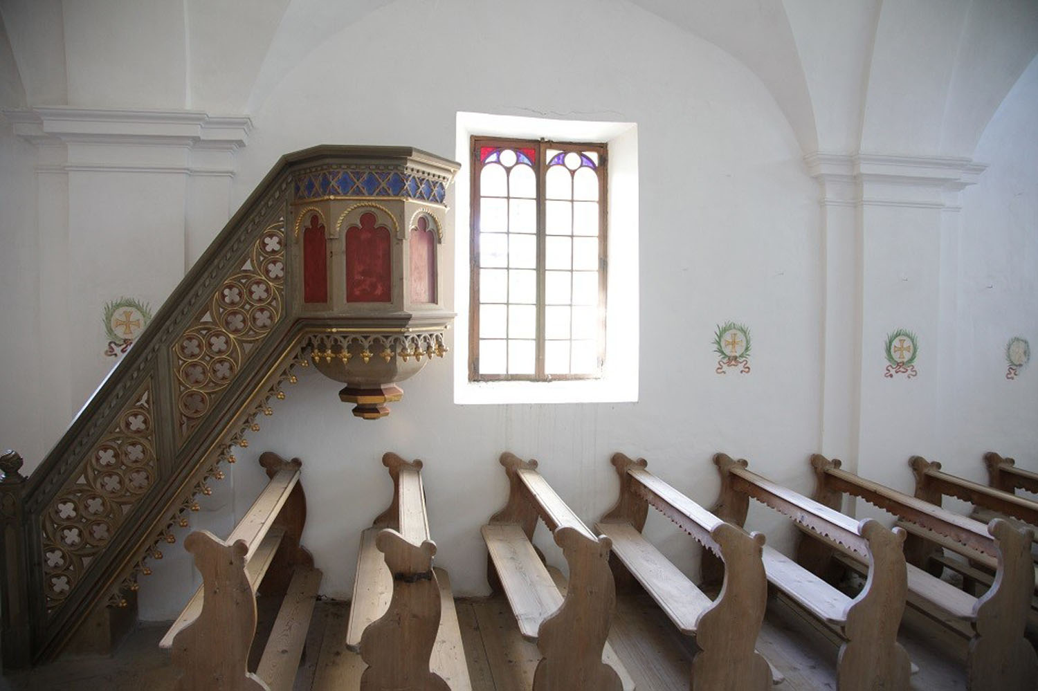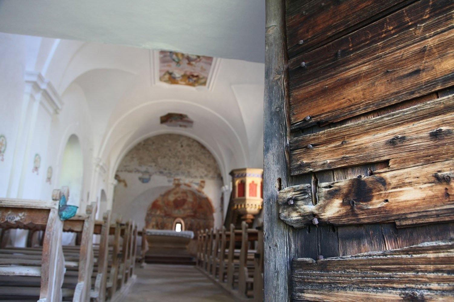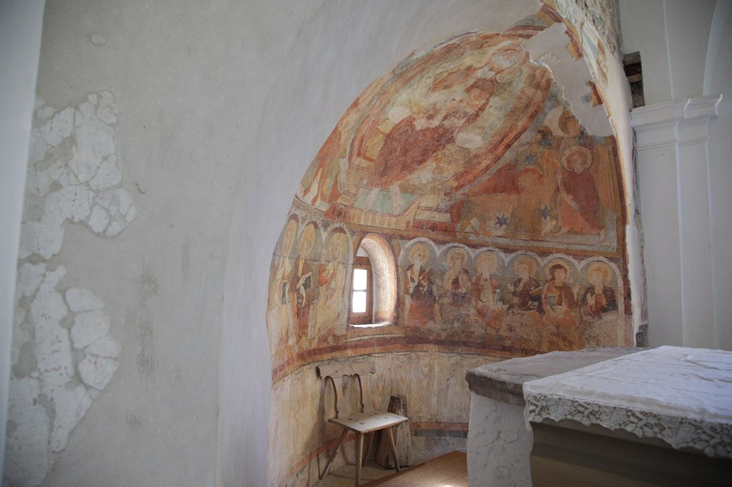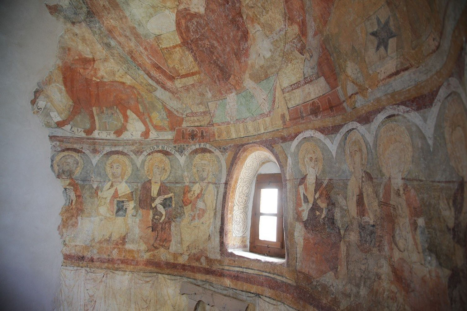 1917 hat man mit der Freilegung der Fresken in der Apsiswölbung begonnen. Eine erste Schicht von Bildern, die 1380 entstanden waren, wurde abgehoben und ist seither verschollen. Darunter befand sich die ältere Schicht, die vor kurzem restauriert worden ist. Wir sehen hier Christus als Weltenrichter, umgeben von den Evangelistensymbolen und den Engeln. Darunter reihen sich die Apostel in Gruppen zu je zwei, welche miteinander im Gespräch zu sein scheinen. Während der Inhalt der Gemälde und die Anordnung der Dekoration noch ganz der Romanik zuzuschreiben sind, sehen Kunstexperten in der Ausführung der Apostelgestalten, in der starken Betonung der Konturen, ein deutliches Zeichen dafür, dass sich ein neuer Kunststil ankündigt, nämlich der gotische. Wir stehen hier gewissermaßen am Grabe der Romanik und an der Wiege der Gotik. Daraus ergibt sich eine ziemlich genaue Zeitbestimmung für die Entstehung der Bilder: die Jahrhundertwende um 1300.