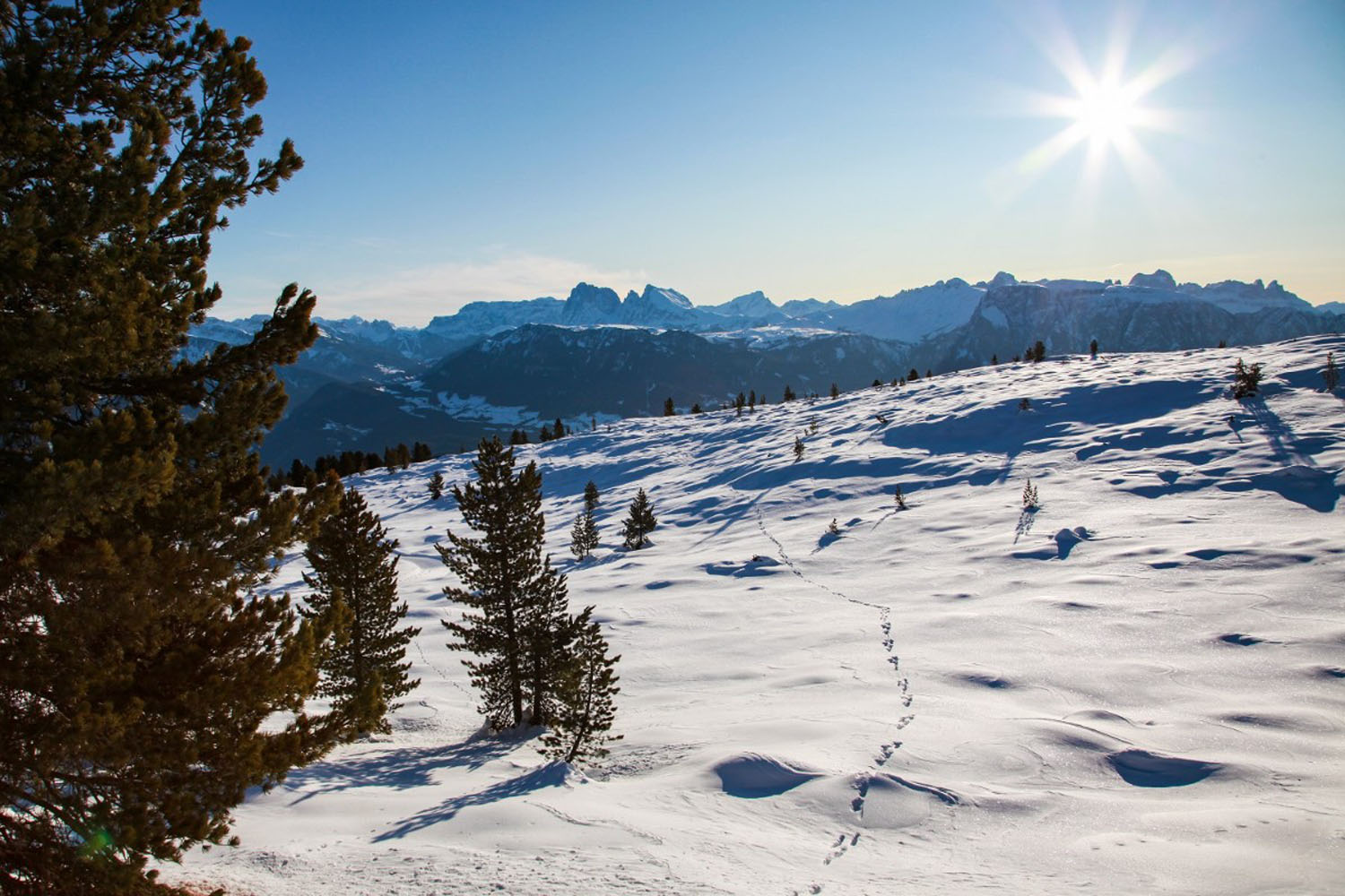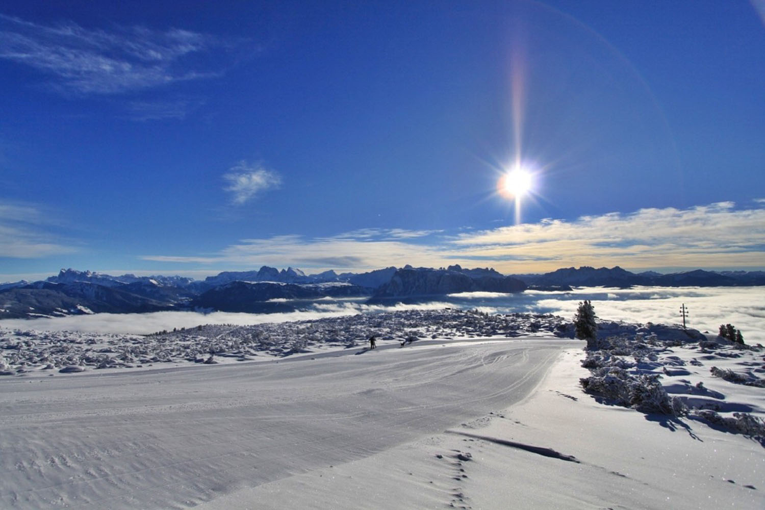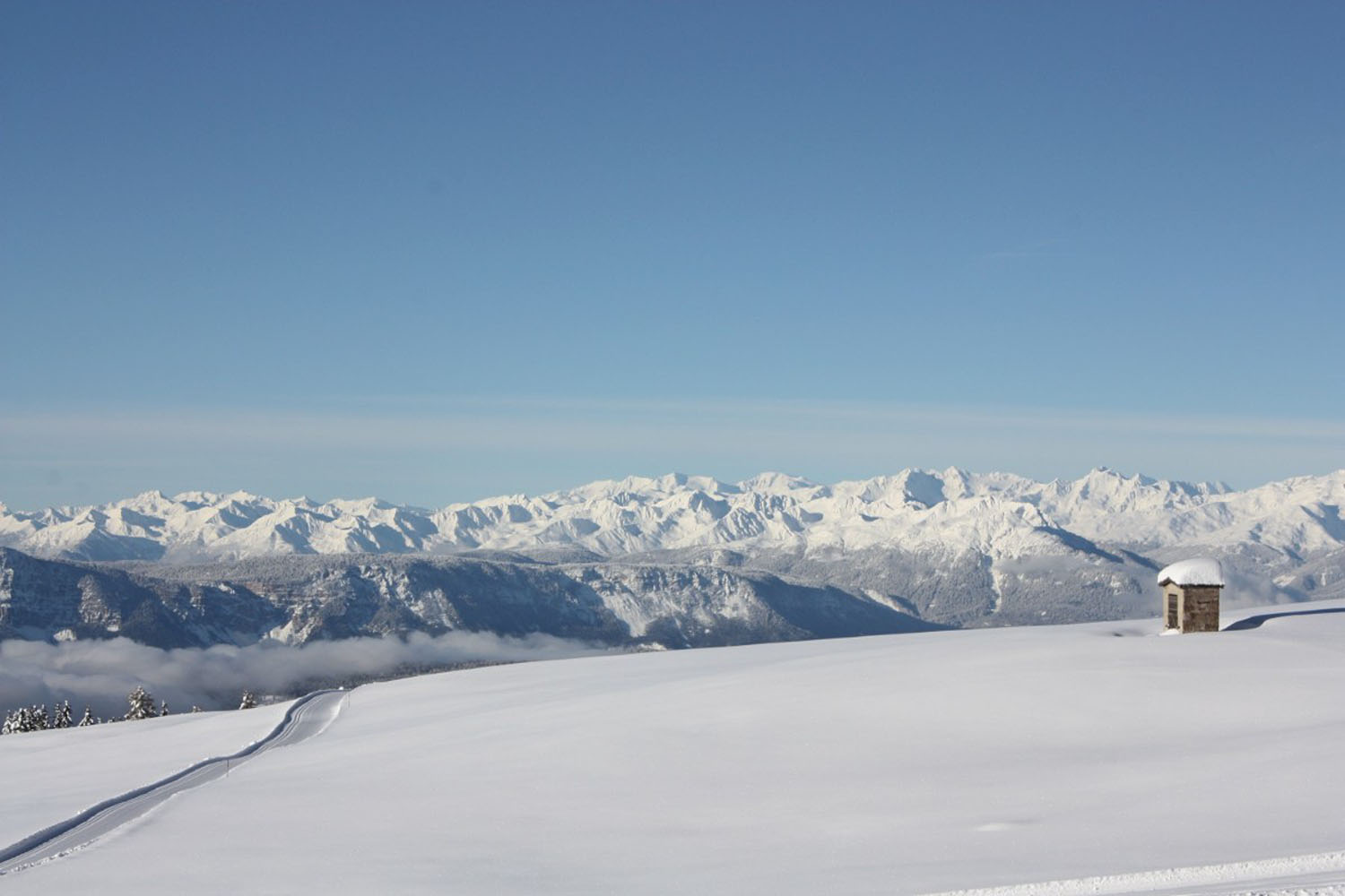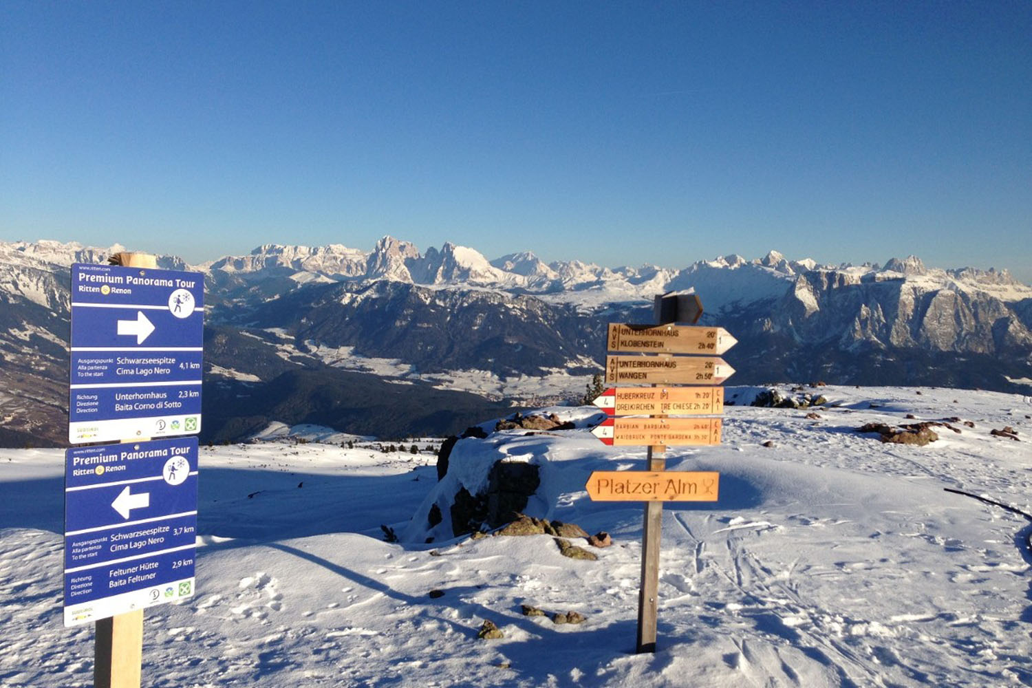 Premium Panorama Tour stapfen so manche Schneeschuhwanderer durch die weißen Weiten. Der Weg führt uns über die weiß glitzernde Alm. Angekommen am höchsten Punkt des Rittner Horns kann man, an einem so klaren Tag wie heute, auf