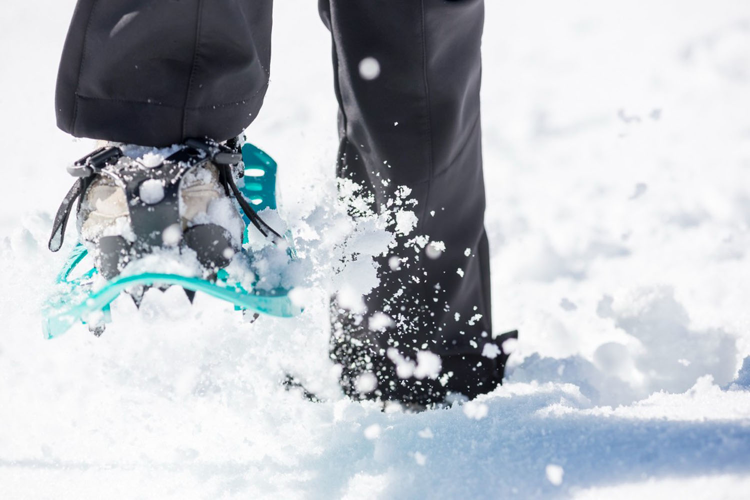 atemberaubende Panorama zu bewundern, das uns umschweift. Bergab knirscht der Schnee leise unter unseren Schuhen. Weiter vorne schwingen sich Skifahrer die breite