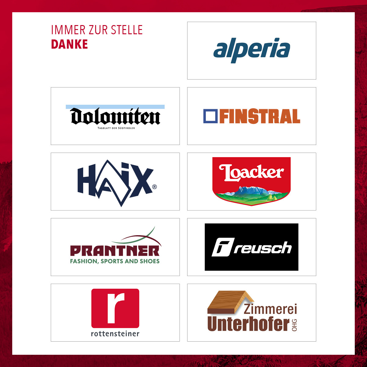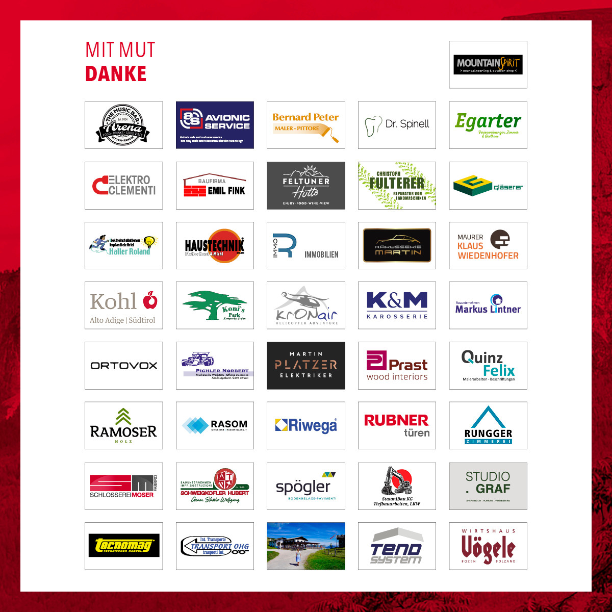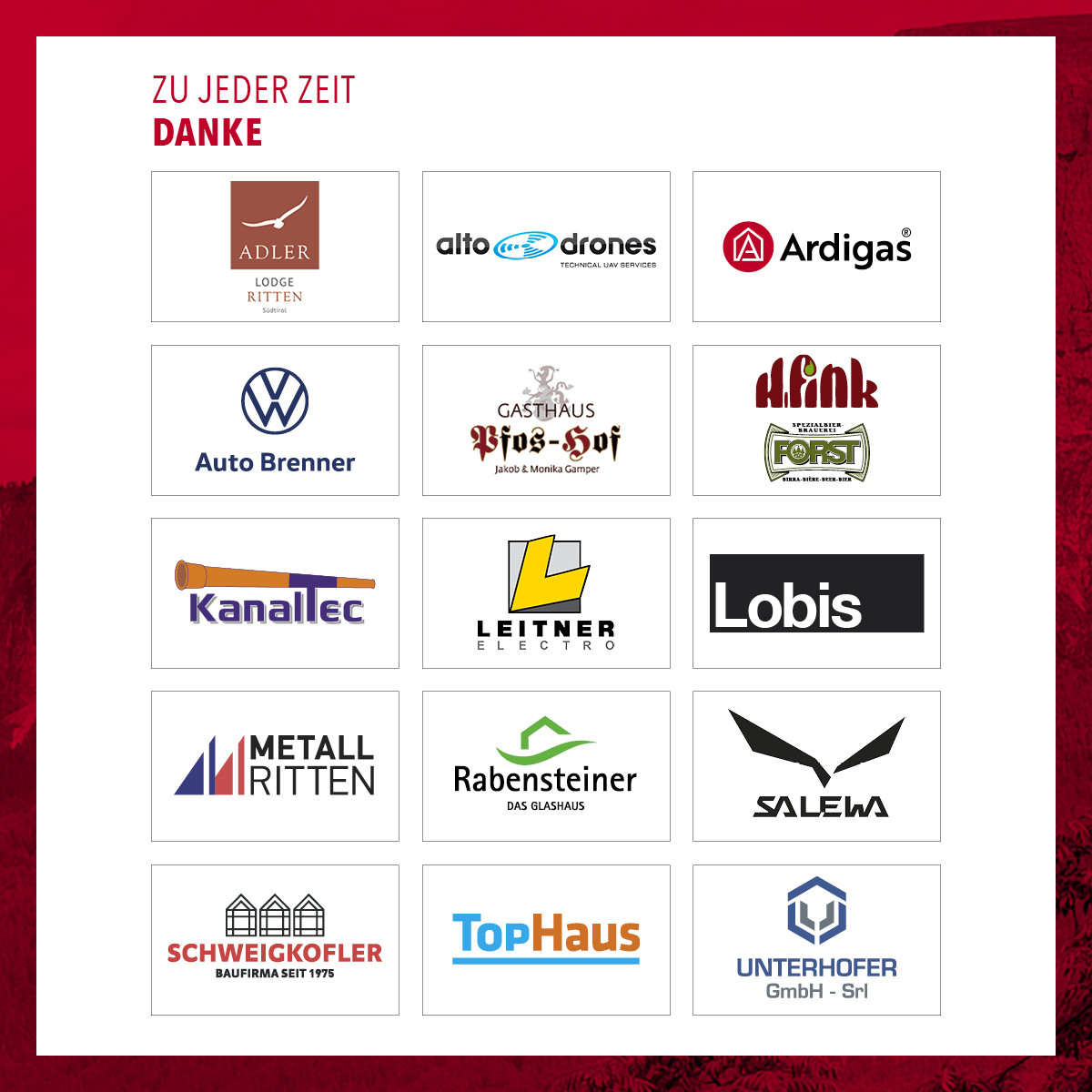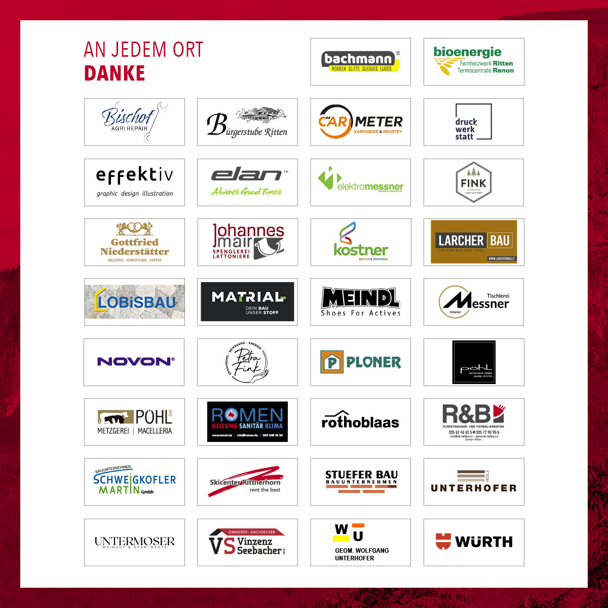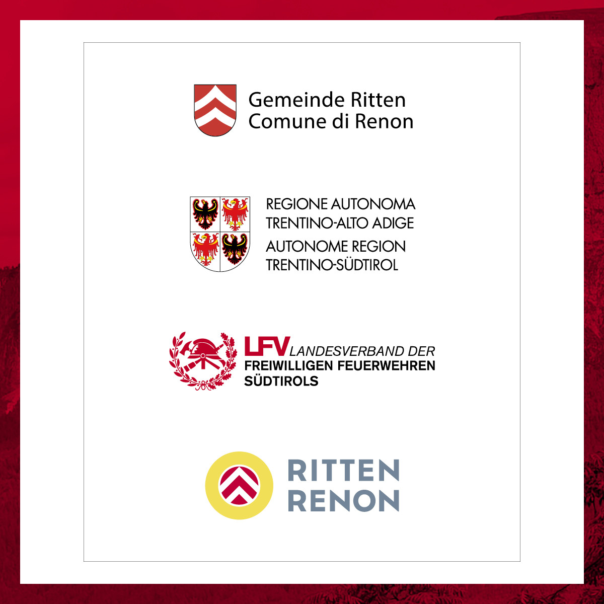 Ein besonderer Dank gilt zudem den öffentlichen Institutionen – der Autonomen Region Trentino-Südtirol, der Gemeinde Ritten, dem Tourismusverein Ritten sowie dem Landesfeuerwehrverband Südtirol – für ihre wertvolle Unterstützung und Begleitungdieses Jubiläumsprojektes.